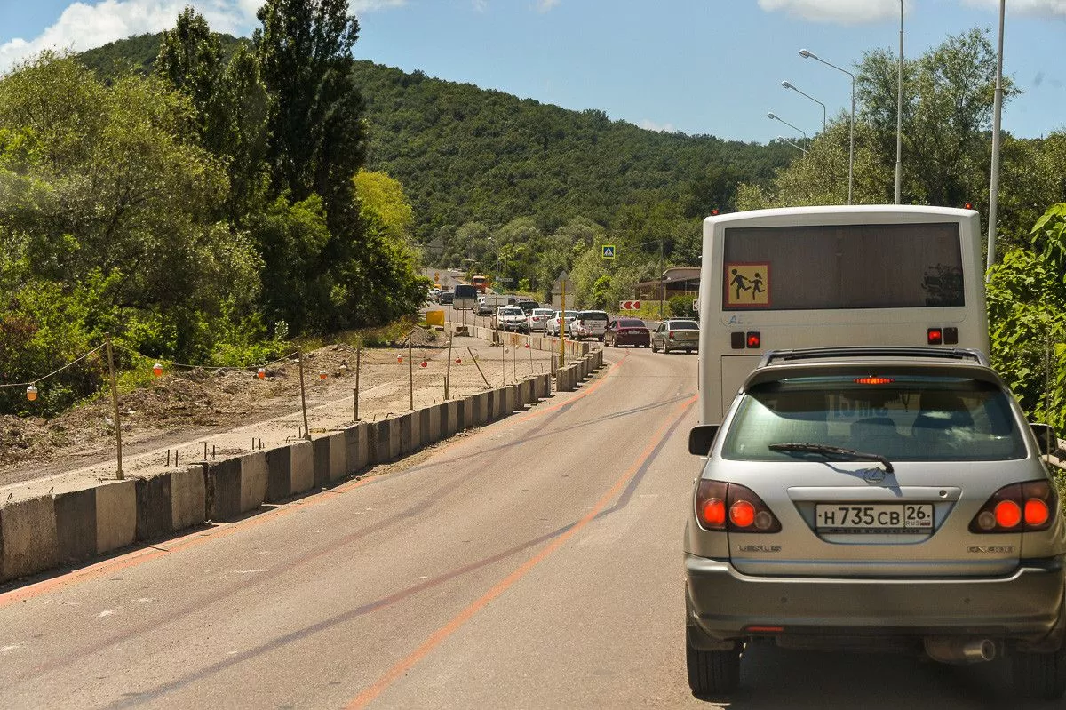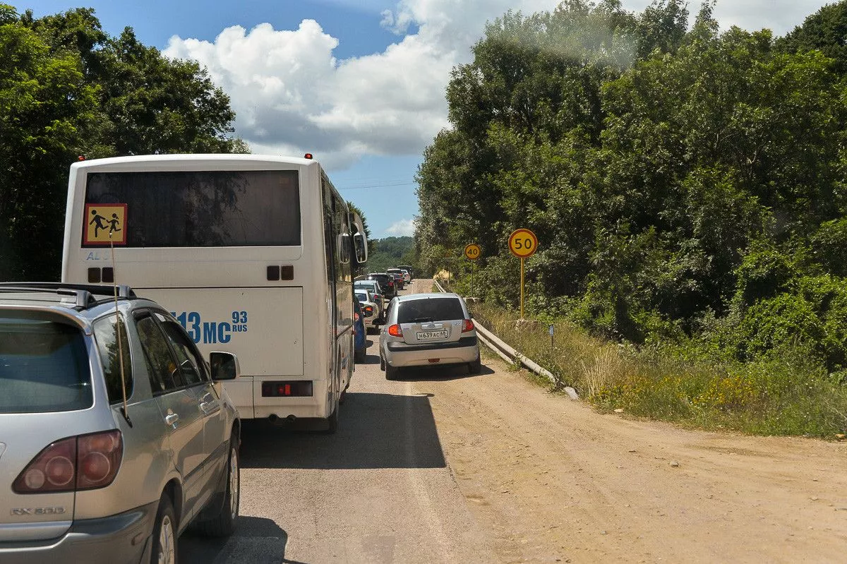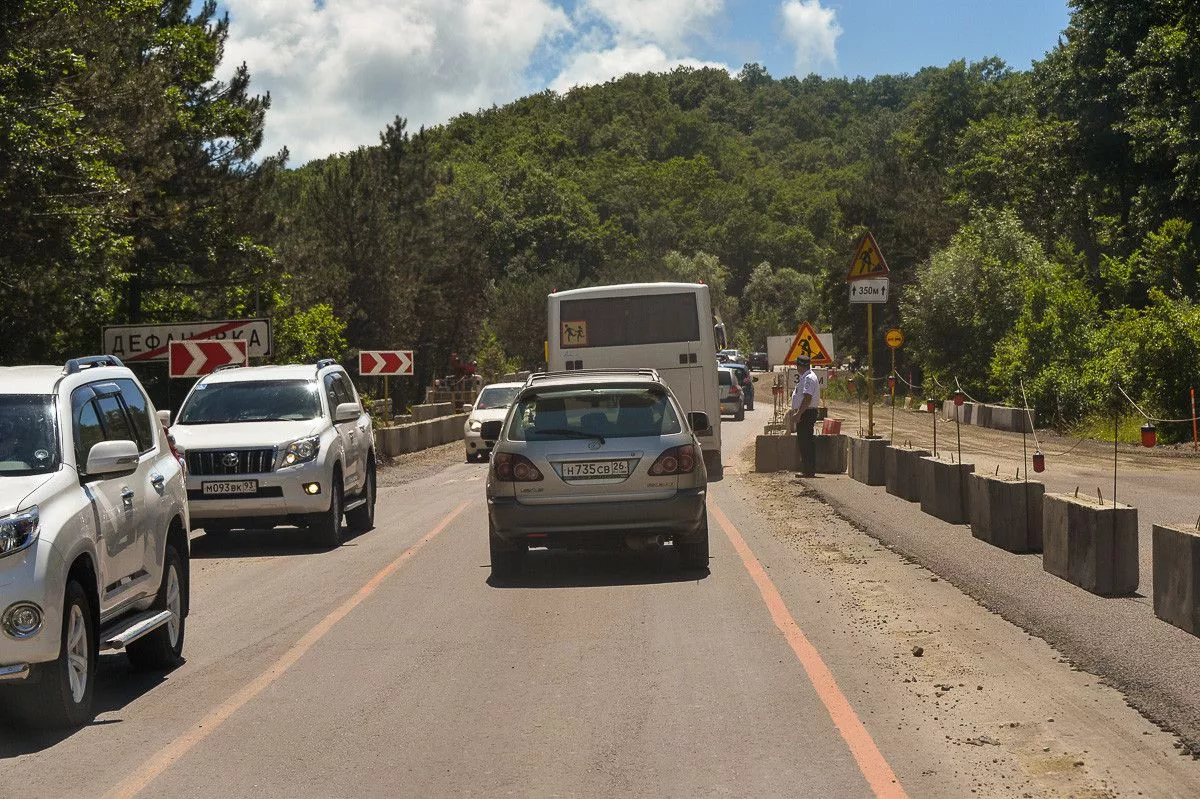 В Туапсинском районе между Дефановкой и Горским идет ремонт дороги, что ведет к постоянным пробкам.