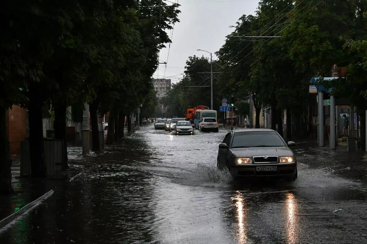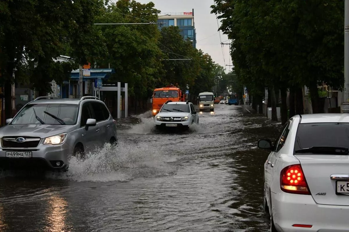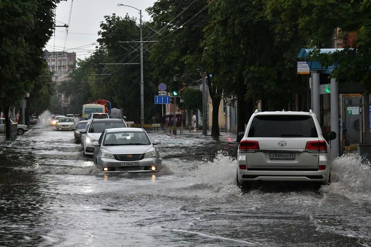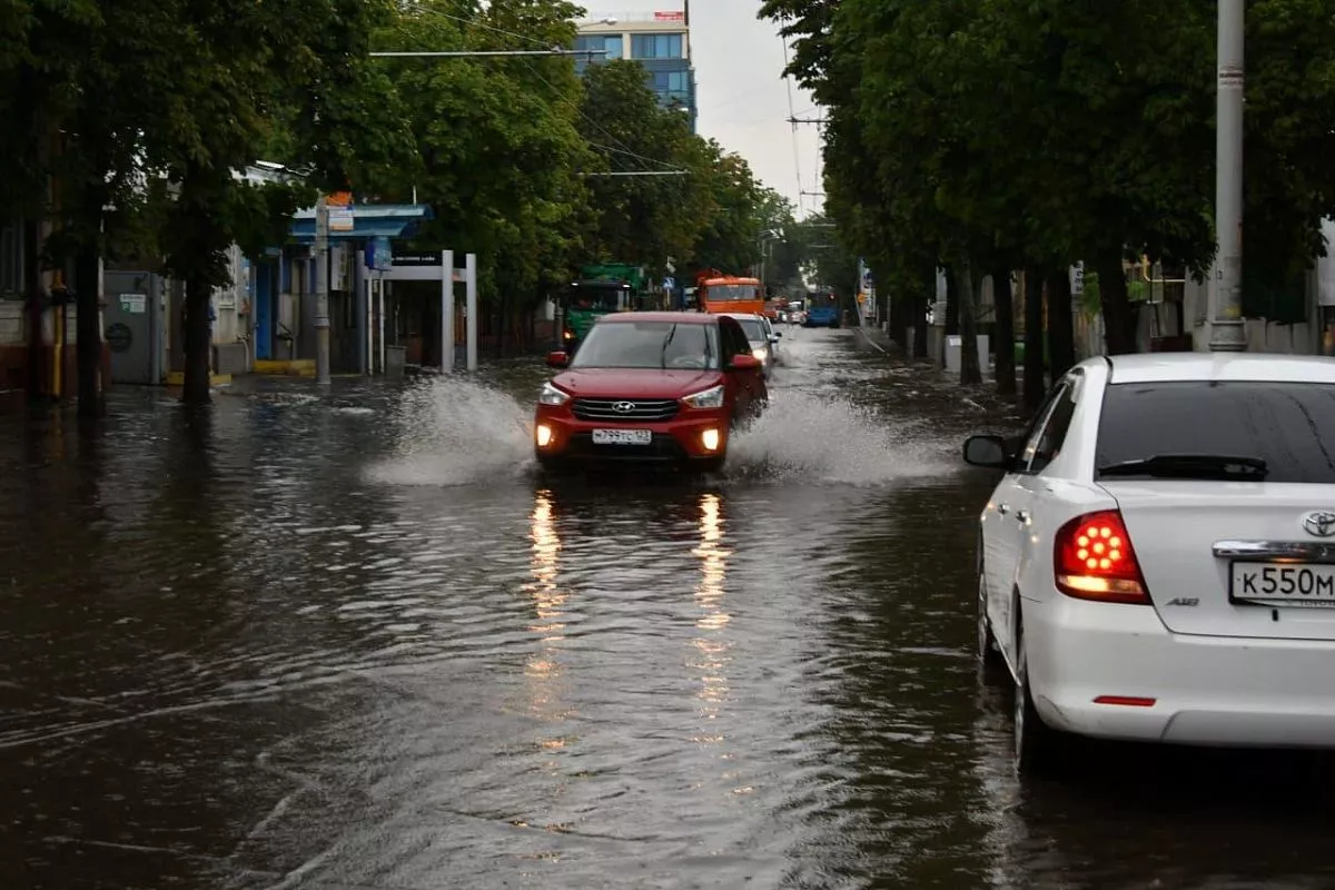 Сильный ливень подтопил улицы в центральной части Краснодара, движение общественного транспорта остановлено на перекрёстках.