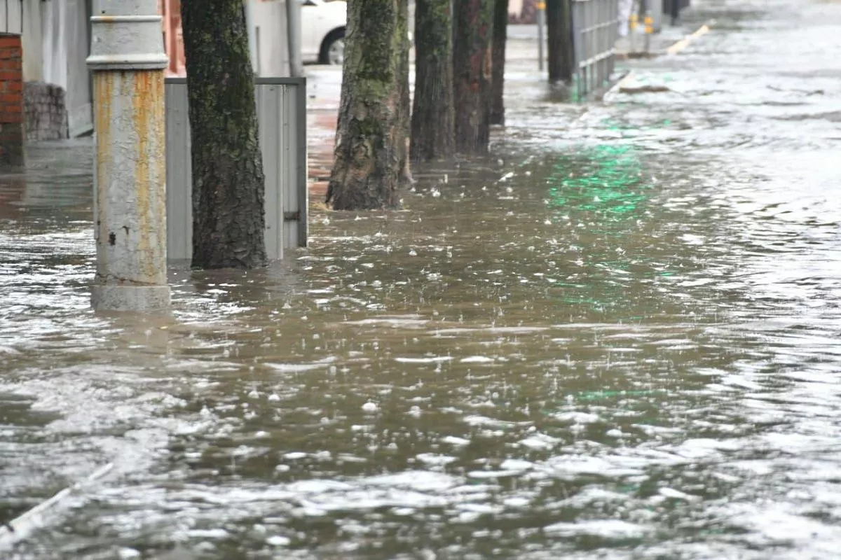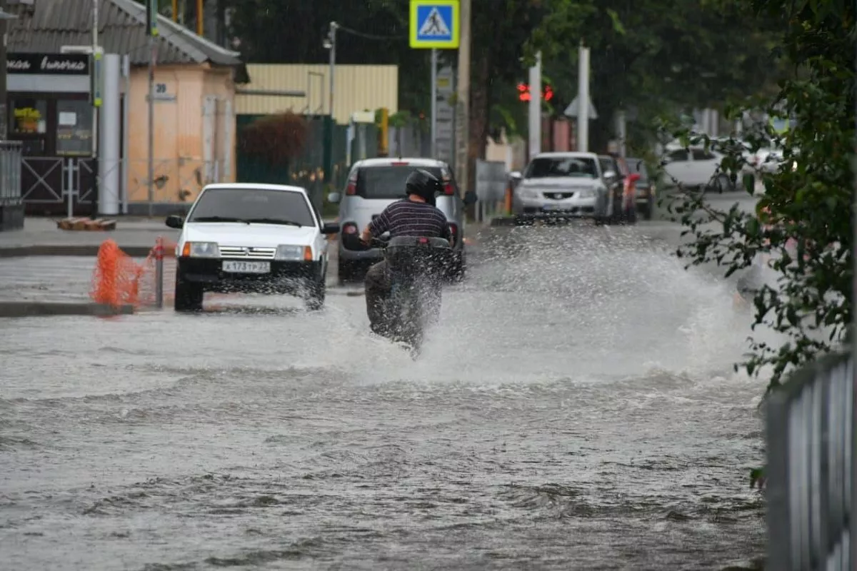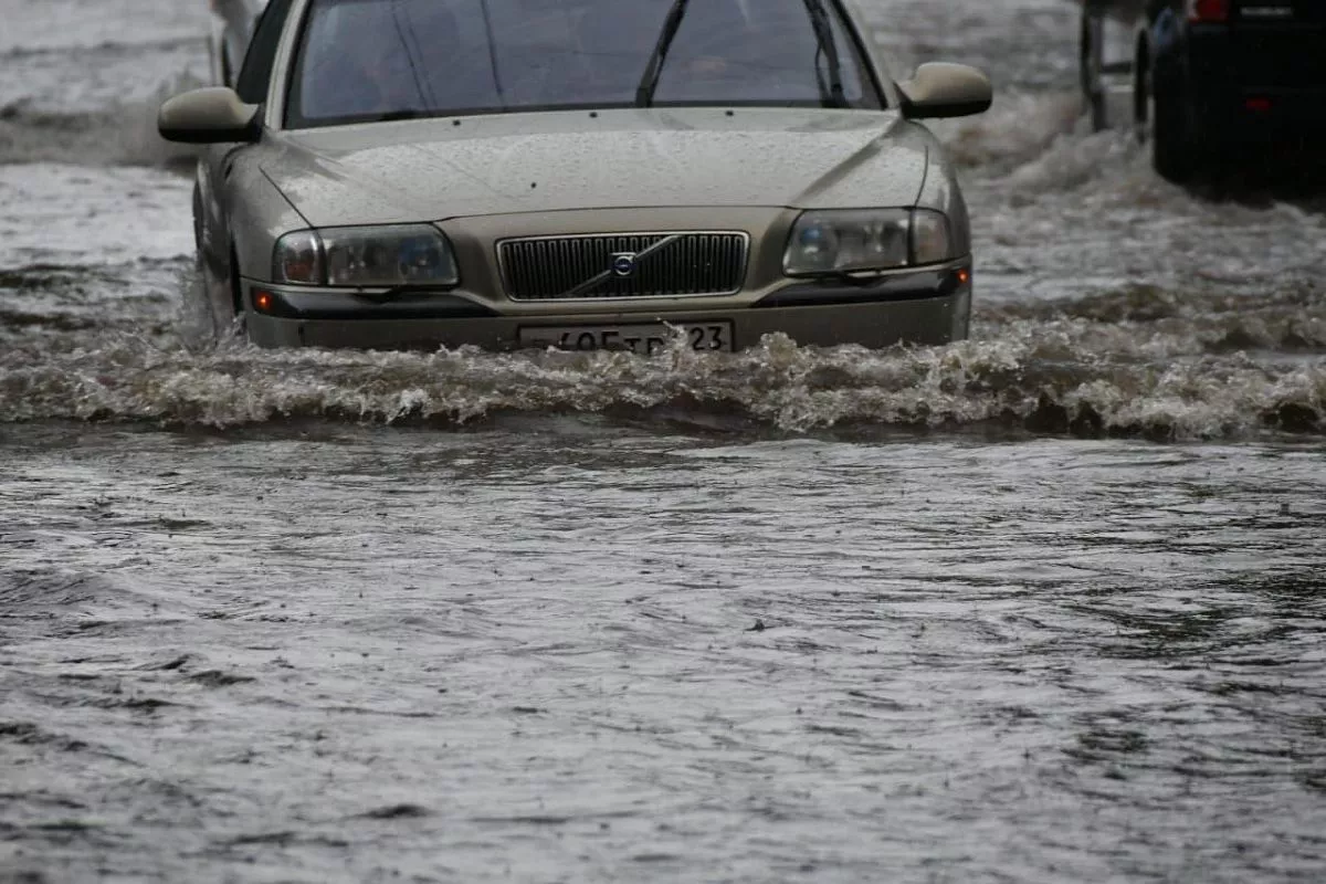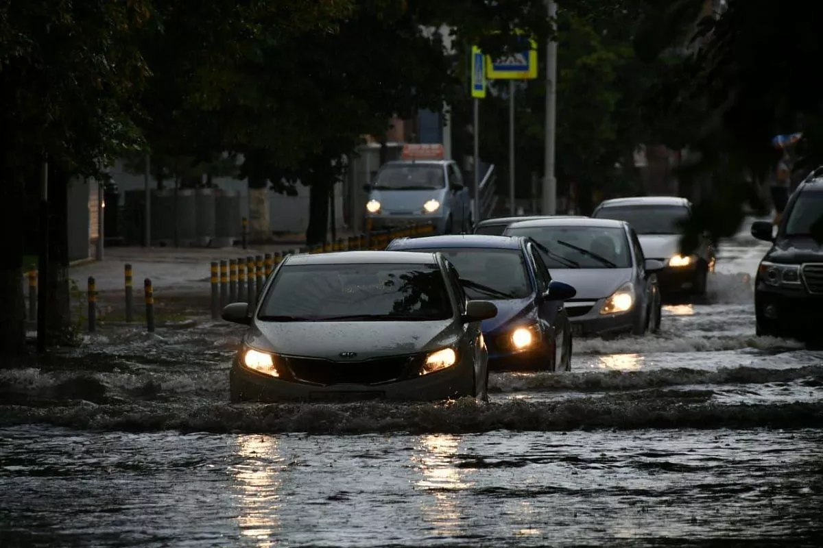 Сильный ливень подтопил улицы в центральной части Краснодара, движение общественного транспорта остановлено на перекрёстках.