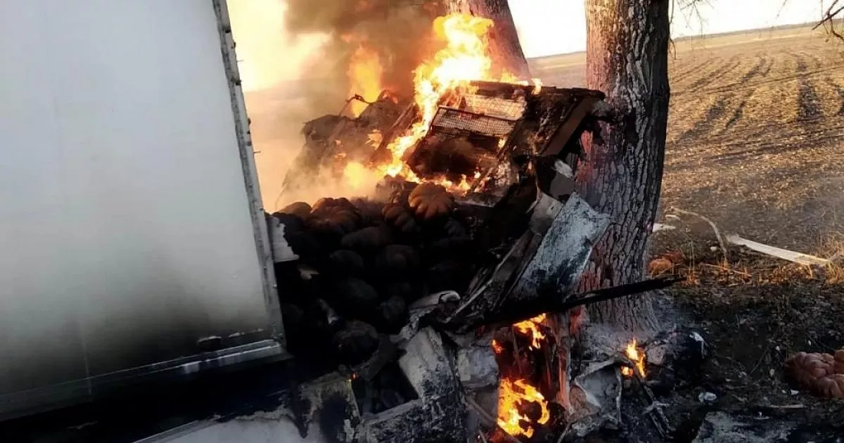По предварительным данным отдела пропаганды управления ГИБДД по краю, у 53-летнего водителя грузовика Renault с полуприцепом во время движения разорвалось колесо. Машина выехала на полосу встречного движения, съехала на обочину и врезалась в дерево. После этого автомобиль загорелся.