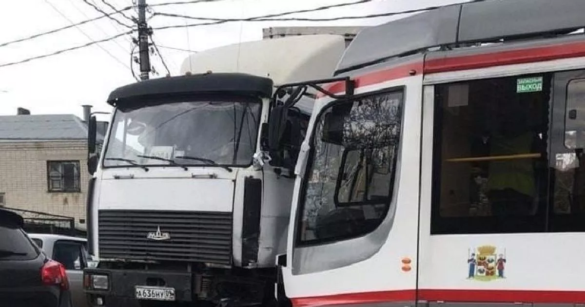 Произошло столкновение. В результате ДТП никто не пострадал. Водителю грузового автомобиля выписали штраф в 1000 рублей за то, что он не предоставил преимущество в движении трамваю.
