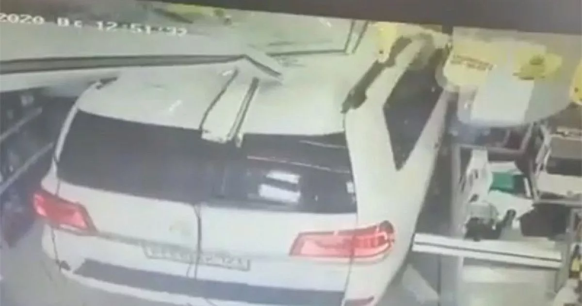 Затем автомобиль резко дает задний ход и выезжает из помещения, оставив после себя разбитые стекла и поломанные прилавки.
