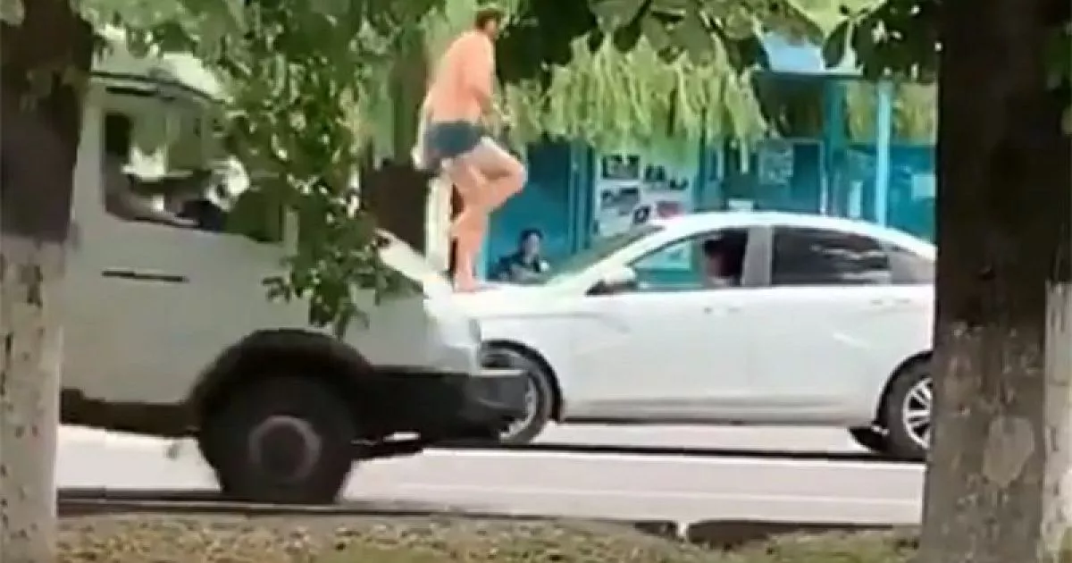 Со слов очевидцев, которые активно комментируют видео в социальных сетях, сначала странный человек в одних трусах прыгал по проезжающим машинам, за что в комментариях получил прозвище «человек-паук».