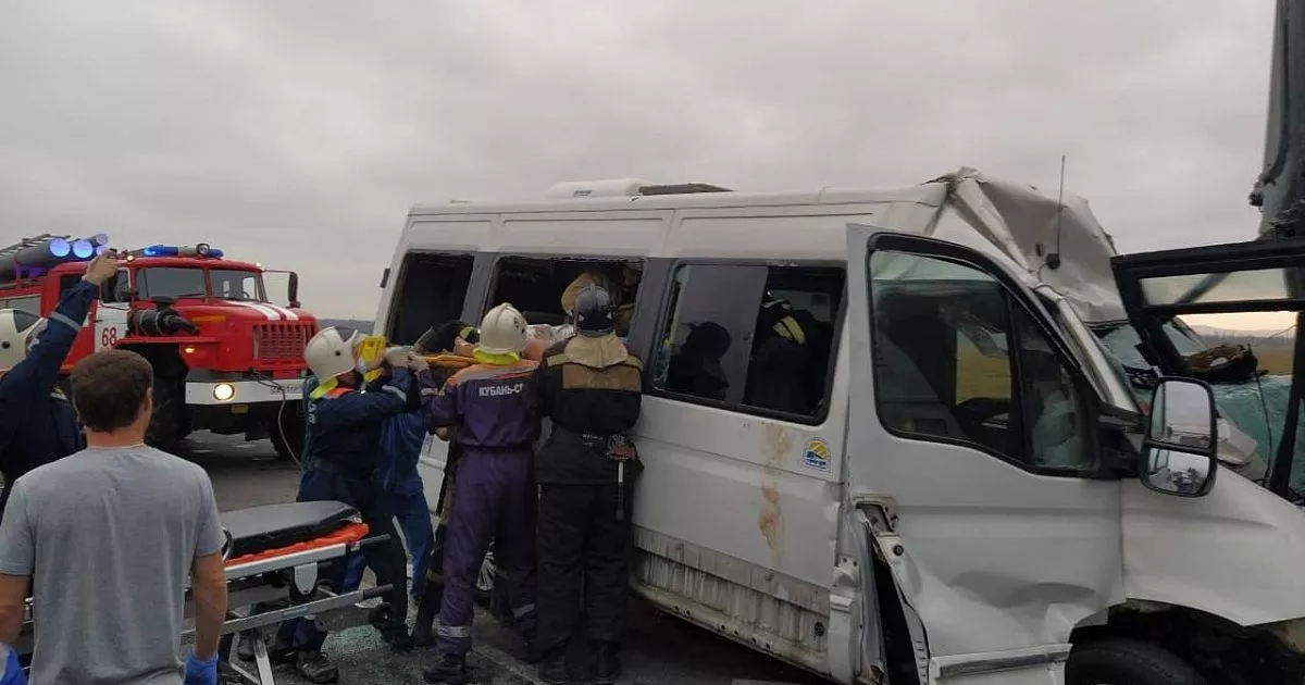 На месте столкновения двух автобусов в районе поселка Витязево в Анапе работали спасатели, им приходилось доставать пострадавших из завалов.