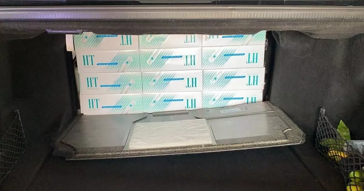 Еще один тайник был оборудован за обшивкой, разделяющей багажное отделение и салон автомобиля. Здесь были спрятаны еще 24 блока сигарет HTSuperslims. Общее количество изъятых сигарет составило 864 пачки, 17280 штук.