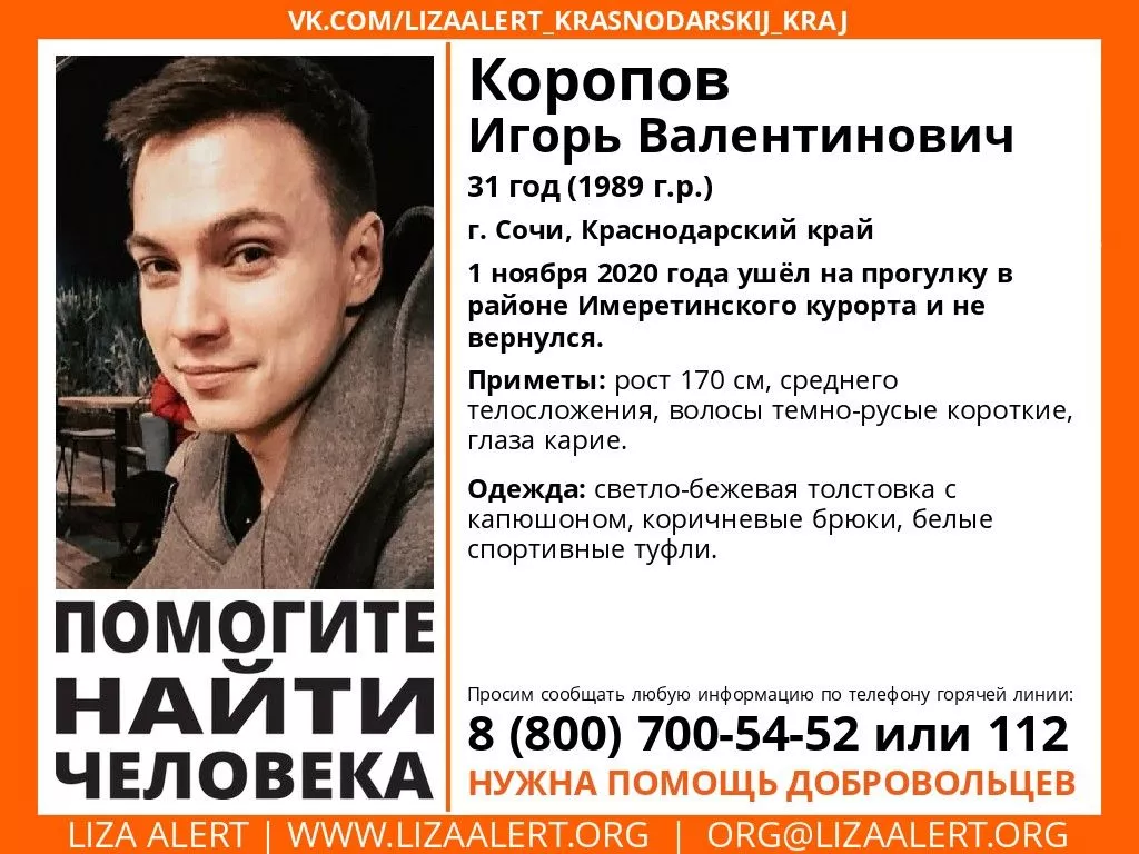 По информации поискового отряда «Лиза Алерт» в Краснодарском крае, 1 ноября Игорь Коропов ушел на прогулку в районе Имеретинского курорта и не вернулся.