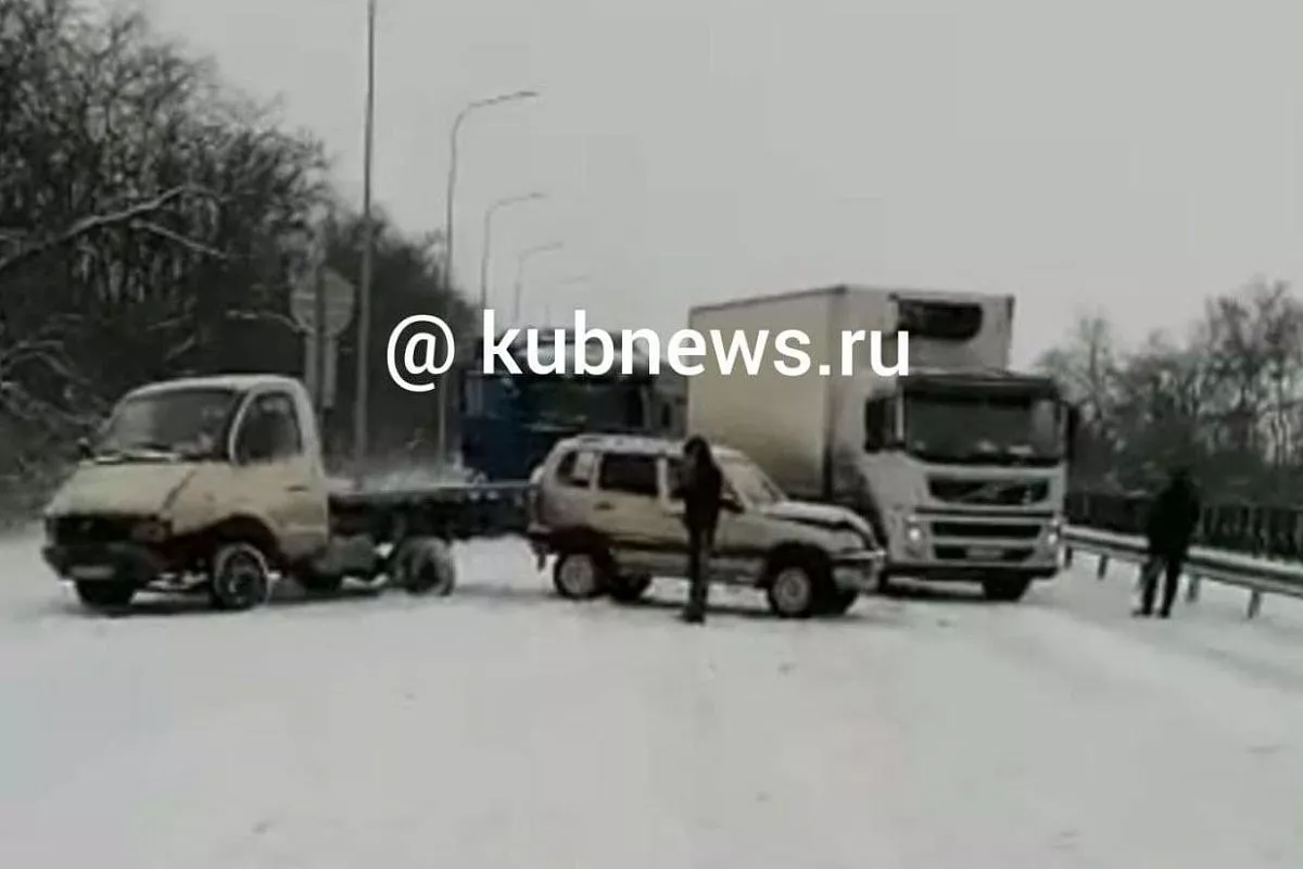 Около 09.30 на федеральной трассе А-146 столкнулись четыре грузовика, 12 легковых машин и один рейсовый автобус «Гулькевичи – Геленджик».