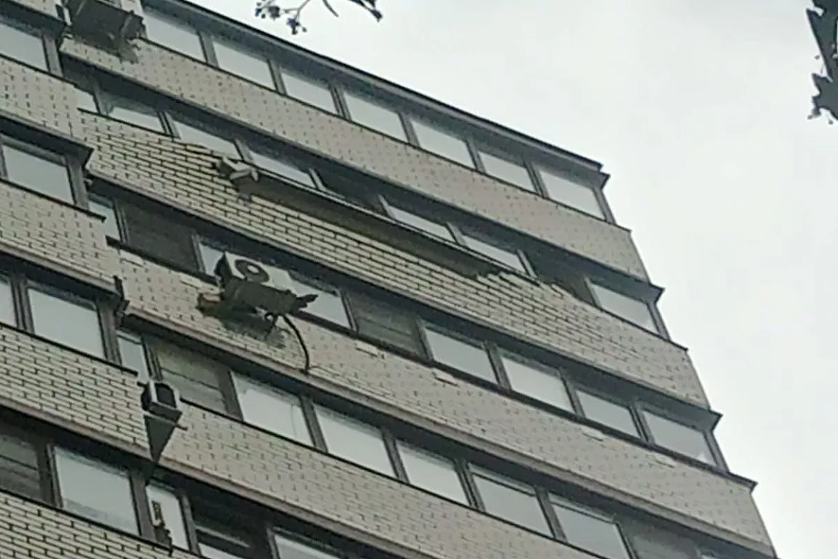 На улице Тюляева ветер сдул кирпичную кладку балкона 15-го этажа многоквартирного дома. Кирпичи упали на припаркованные возле многоэтажки автомобили.