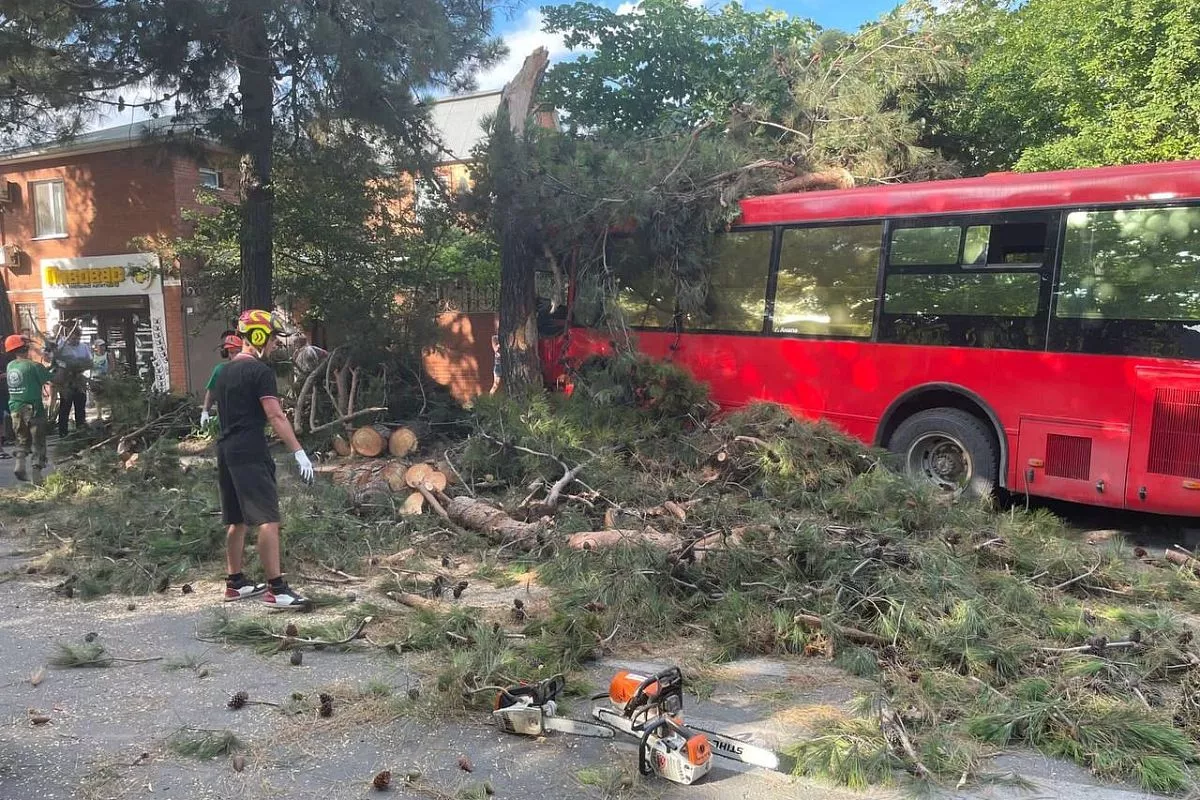 По предварительным данным, водитель «Мазды» не уступил дорогу маршрутному автобусу. Произошло столкновение. От удара автобус поменял траекторию движения, он врезался в дерево, которое упала на проезжую часть.