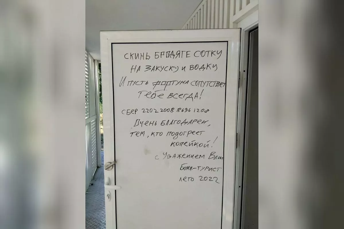 Далее указывается номер счета в банке, на который можно перевести деньги. Подпись «С уважением, ваш бомж-турист. Лето-2022».