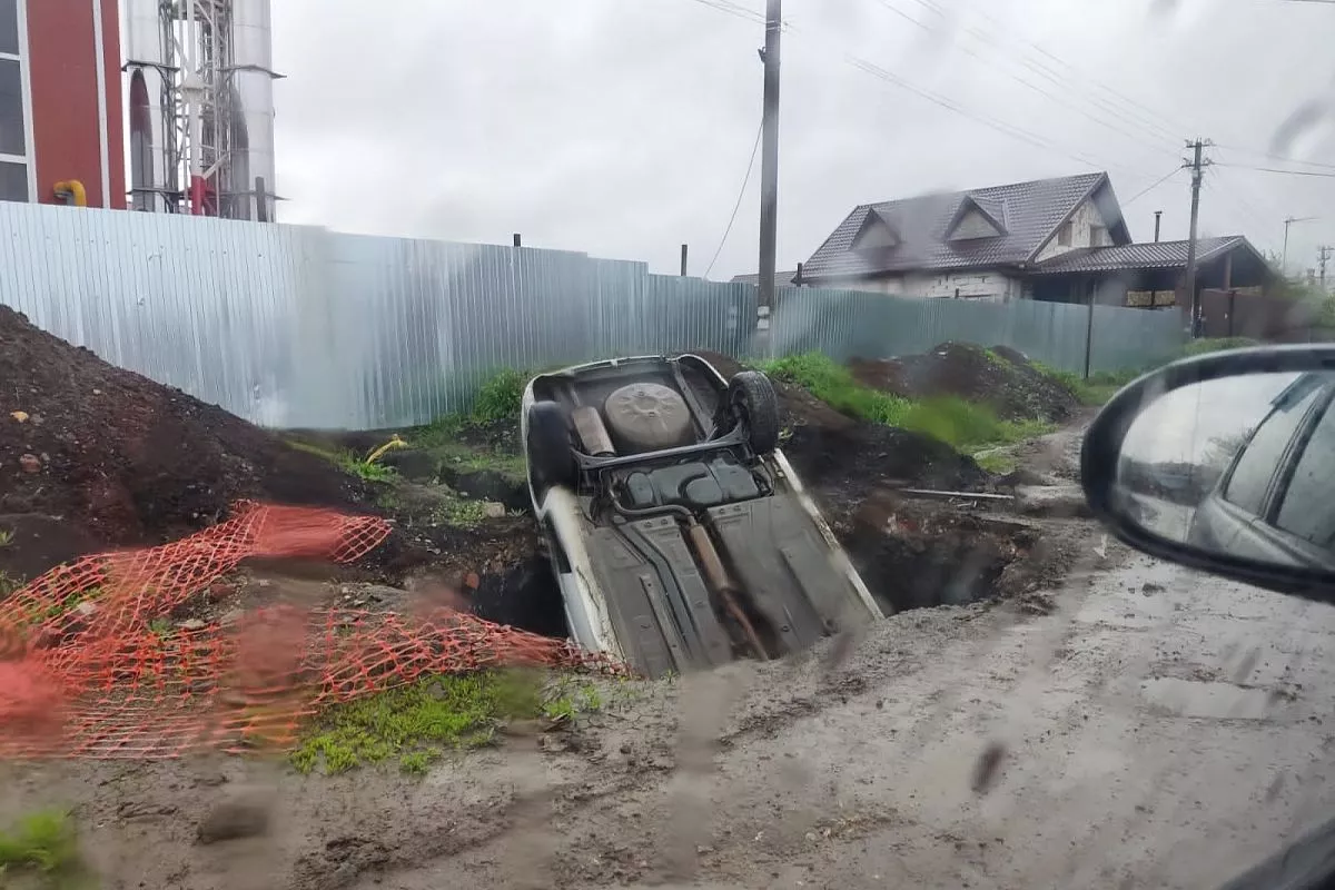 ДТП, в котором обошлось без пострадавших, произошло в районе Западного обхода в Краснодаре. Водитель такси решил объехать пробку по гравийной дороге, но не заметил на обочине огромную яму. Машина провалилась в нее почти полностью, опрокинувшись вверх колесами.