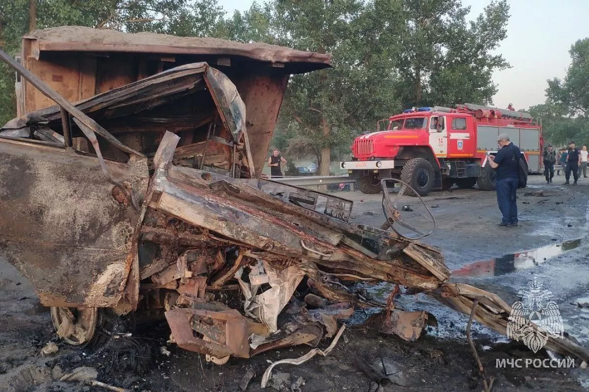 В автобусе находились 25 человек. После столкновения большегруз загорелся.