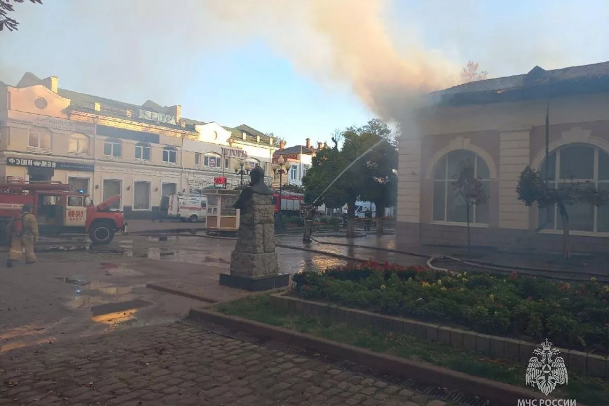 Сегодня около 06.00 в историческом центре Ейска загорелось здание. Огонь охватил строение на пересечении улиц Свердлова и Ленина. Прибывшие наместо происшествия подразделения установили, что пламя распространилось по кровле на площади 200 квадратных метров, сообщает пресс-служба ГУ МЧС России по Краснодарскому краю.