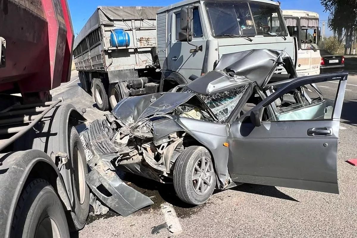 Сегодня на автодороге Краснодар–Славянск-на-Кубани–Темрюк водитель КамАЗА с полуприцепом не выбрал безопасную дистанцию до попутной «Лады», под управлением 63-летней местной жительницы и допустил столкновение. От удара легковушку отбросило на стоящий КамАЗ с полуприцепом.