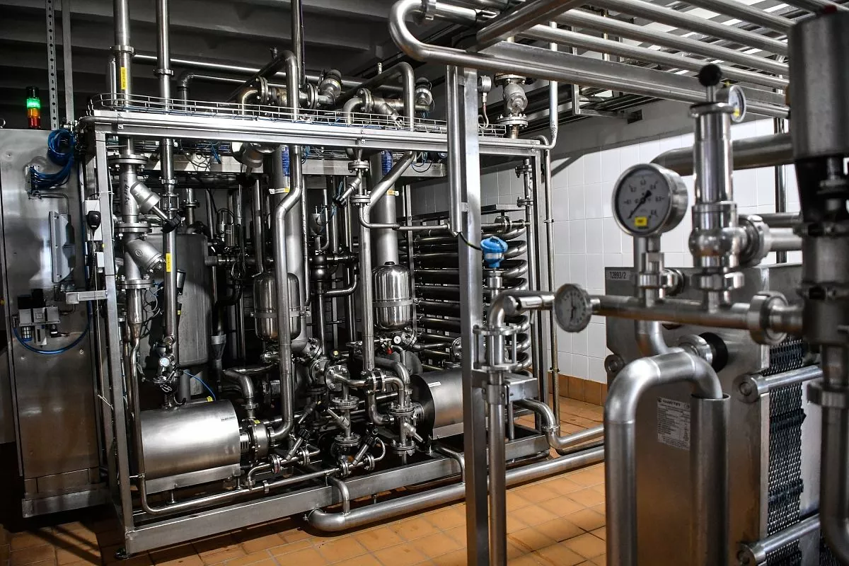Из цеха молокоприемки переходим на территорию аппаратного участка. Здесь принятое к производству молоко разделяется на категории, очищается и проходит необходимую стадию обработки. А затем по молокопроводам подается в цех фасовки.