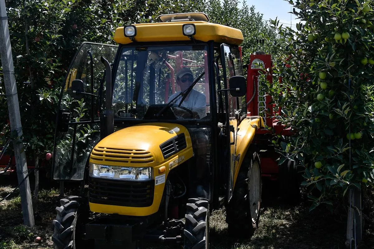 – Выращиваем яблоки, сливу, грушу, черешню… А еще пшеницу, подсолнечник, ячмень и кукурузу, – рассказал Александр Акимов. – Упаковываем фрукты двумя автоматическими линиями. Производим яблочный сок прямого отжима. Имеем собственный тракторный и автомобильный парк.