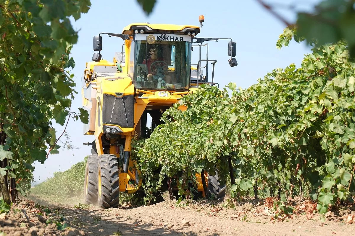 Много лет назад урожай янтарной ягоды здесь убирали вручную. Теперь на виноградники выходят мощные комбайны. Одна такая машина способна заменить работу сотни человек.