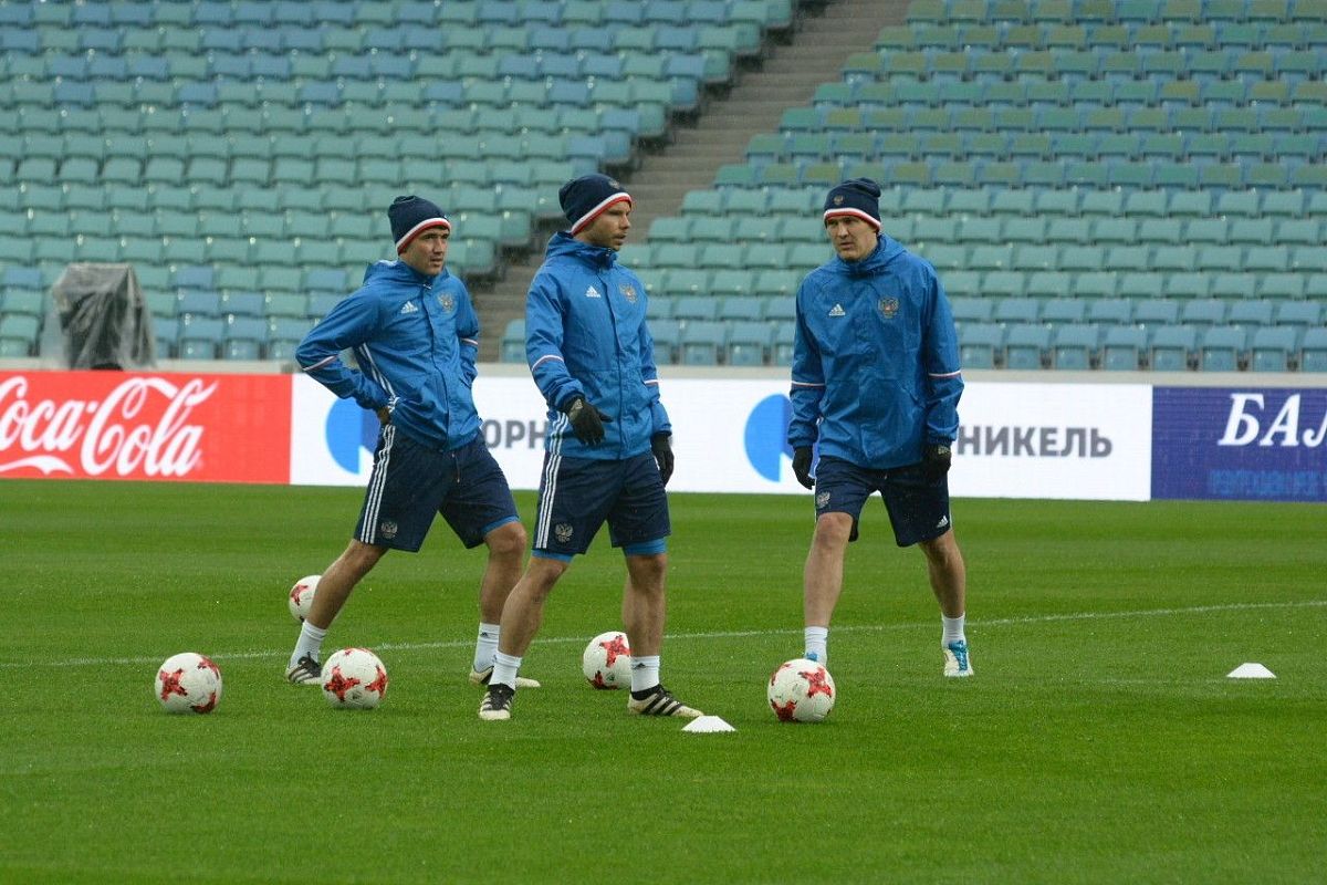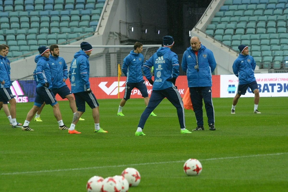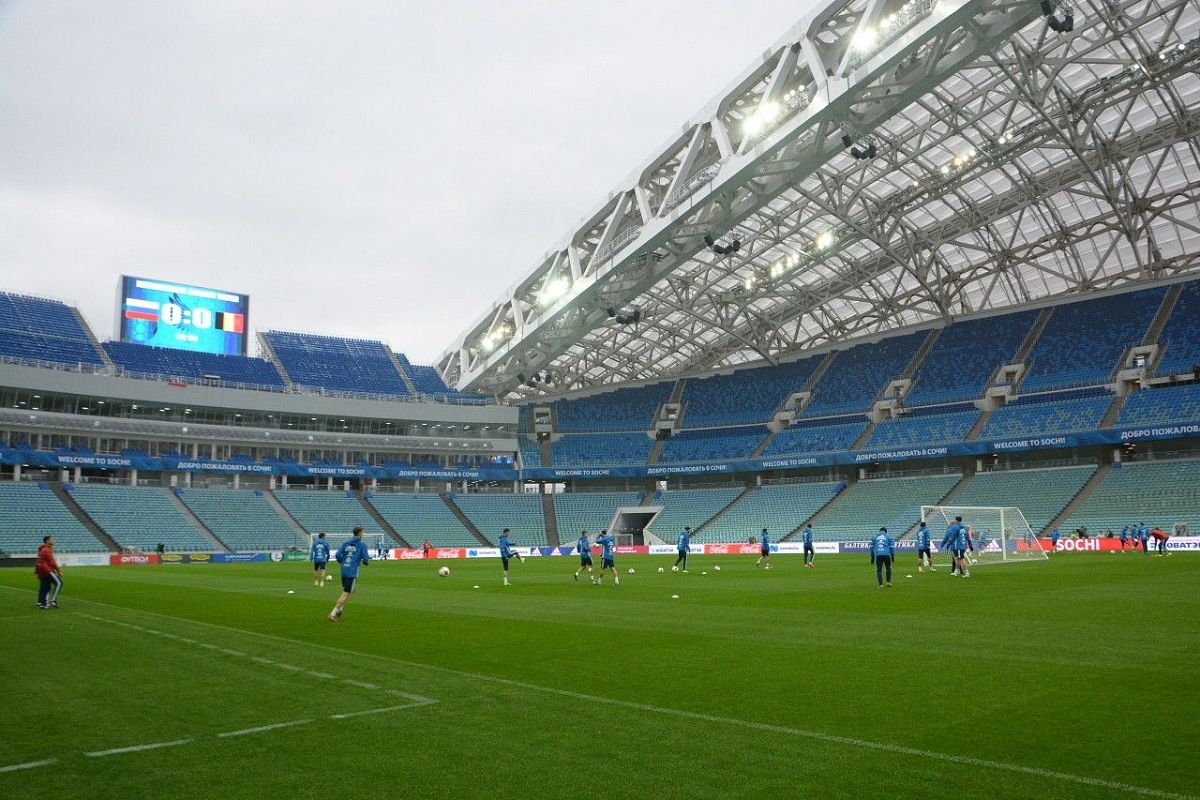 Полчаса пути и сборная России, вылетев из Краснодара, приземлилась в Сочи. Небесная канцелярия, видимо, обидевшись, на проигрыш Кот-д'Ивуару (игра состоялась в Краснодаре 24 марта и закончилась со счетом 0:2 в пользу ивуарийцев), поприветствовала футболистов холодным проливным дождем. Но кубанское гостеприимство немного согрело - от трапа самолета для команды расстелили красную ковровую дорожку и встретили в национальных костюмах с хлебом и солью. Подбодрить футболистов было важно, ведь уже завтра, 28 марта, они сыграют в рамках подготовки к Кубку конфедераций контрольный матч против Бельгии. Этот же матч станет открытием сочинского стадиона «Фишт» - реконструкция арены после Олимпийских игр-2014 полностью завершена.