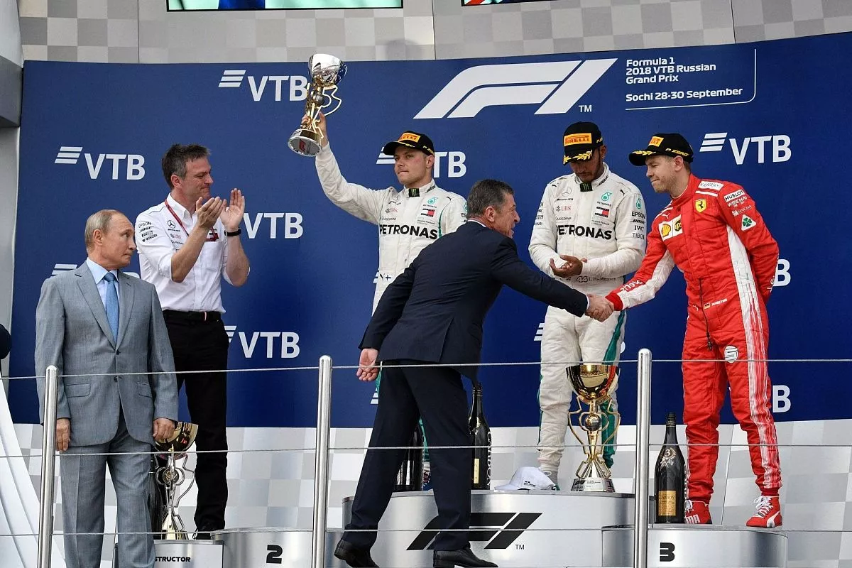 Как и полагается, прозвучал гимн Великобритании в честь победы Льюиса Хэмилтона. После чего награды победителям вручил президент РФ Владимир Путин.