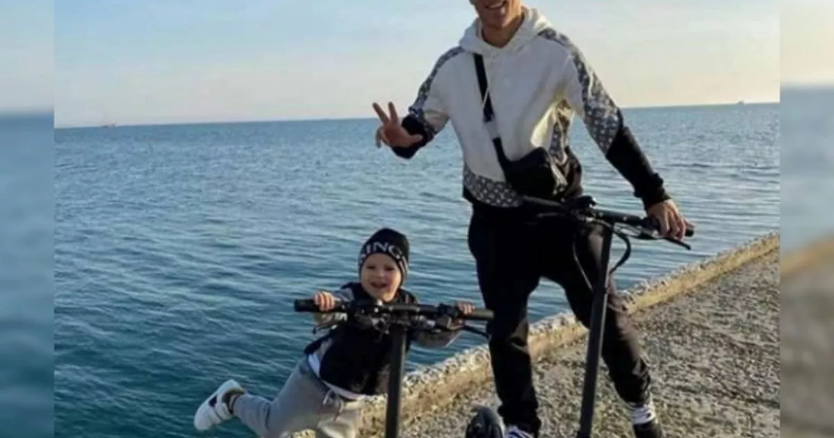 На снимке футболист и Майкл, которому в июне исполнится три года, стоят на набережной Сочи на одинаковых самокатах.