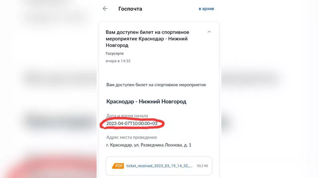 Некоторые футбольные болельщики в Краснодаре столкнулись с необычной проблемой перед ближайшим матчем ФК «Краснодар» с «ФК «Пари Нижний Новгород». Как известно, поединок должен состояться в кубанской столице 9 апреля, стартовый свисток прозвучит в 19 часов по московскому времени. Однако после покупки билетов в личном кабинете на Госуслугах указаны совсем другие дата и время начала встречи — 7 апреля в 10:00.