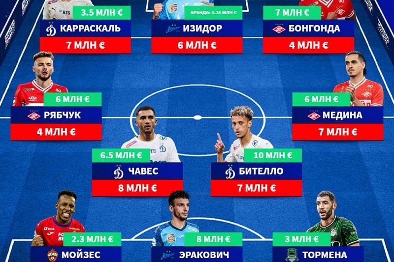 Интернет-портал Transfermarkt опубликовал сборную из самых дорогих трансферов этого лета в Российской Премьер-лиге.