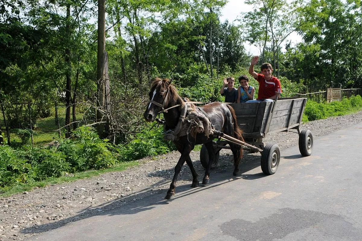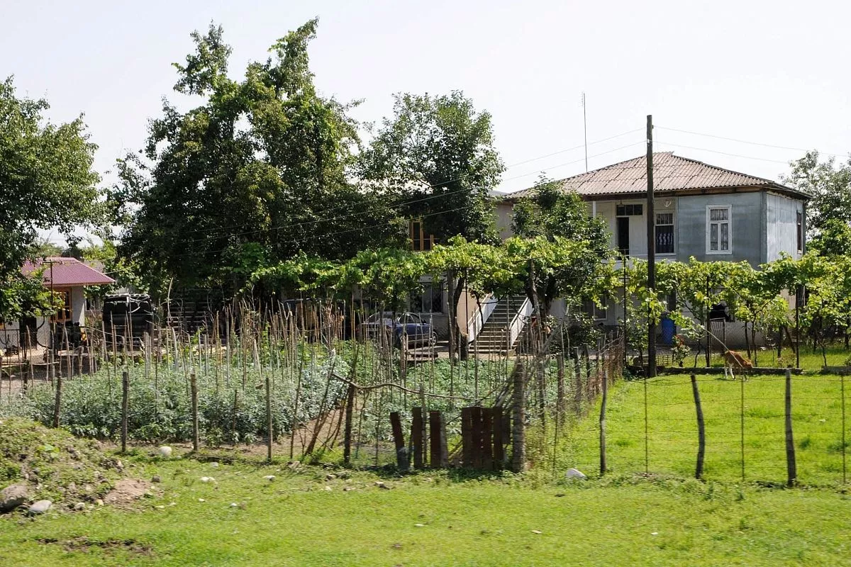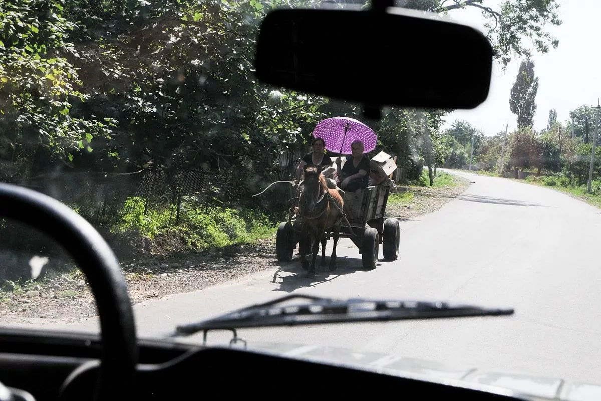 Чем ближе мы подъезжаем к Набакеви, тем больше городской пейзаж вокруг сменяется на сельский. То здесь, то там вдоль дороги прогуливаются коровы, встречаются повозки с лошадьми (как называют их местные – фаэтоны), часто попадаются небольшие домики с ухоженными огородами. Почти в каждом дворе по ограде вьется виноград, из-за забора выглядывают верхушки кукурузы. Глядя на эту мирную картину, не верится в слова наших сопровождающих о том, что в послевоенное время в этих местах еще долго велись активные обстрелы, взрывали машины, поджигали дома.