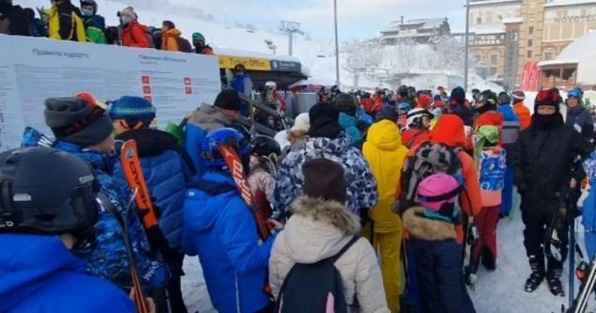 Вместе с этим с самого утра на курорте выстроились очереди из желающих попасть на подъемник. Видеороликами с места туристы поделились в социальных сетях.