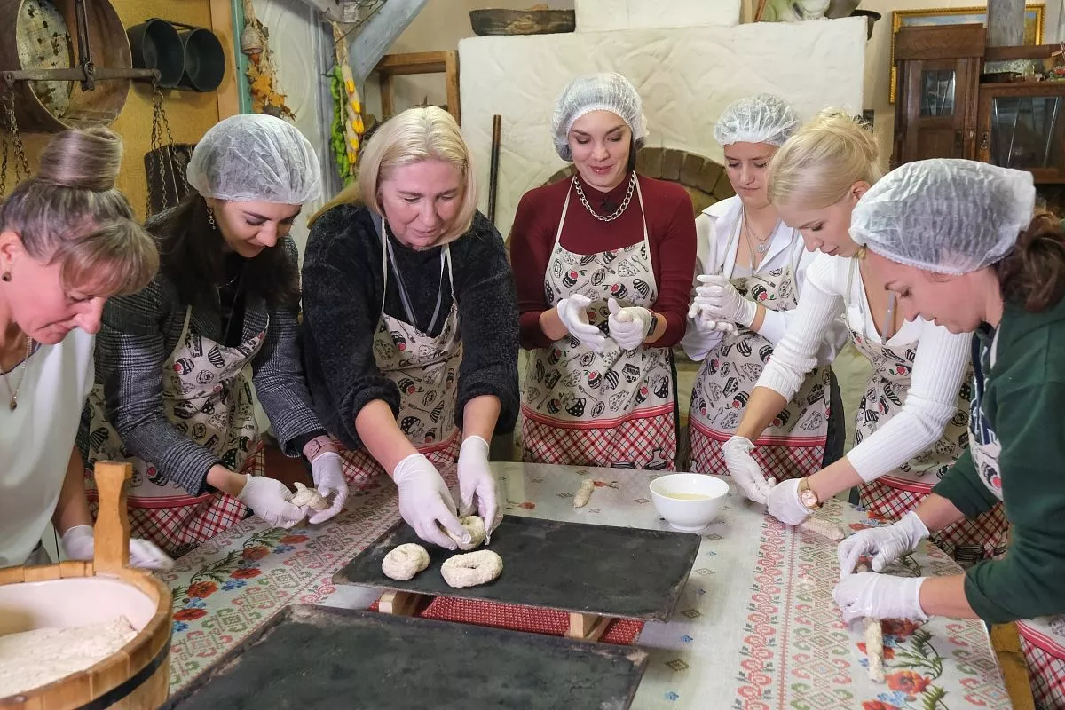 Прямо при туристах гид запускает мельницу. Ее лопасти начинают вращаться, приводя в рабочее состояние весь механизм. На глазах гостей зерно дробится и превращается в муку. Затем туристы отправляются в большой дегустационный зал, где уже разогрета русская печь. Здесь посетителям предлагают самим вылепить хлеб из теста, замешанного на закваске с использованием муки с мельницы. Опытный пекарь ловко отправляет готовые изделия в печь: 15 минут – и все готово. К свежеиспеченному хлебу гостям подают десертное красное и белое вино.