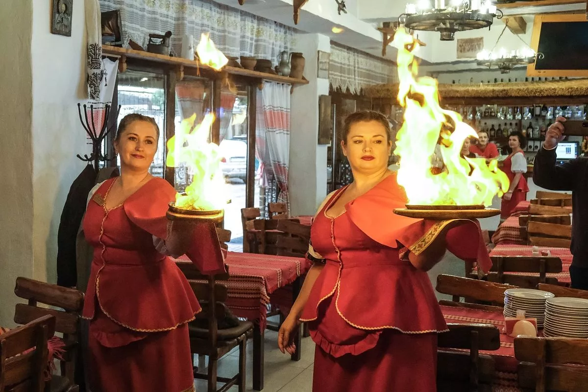 Кроме борща, в ресторане гостям предлагают отведать скоблянку, томленую телятину, вареники с грибами, вишней, картошкой, которые лепятся вручную. А из подачи некоторых блюд делают настоящее шоу. К примеру, сковородки с мясом официантки в костюмах казачек выносят, вылив в них немного горилки. Блюда поджигаются, а когда пламя гаснет, мясо приобретает неповторимый аромат, как будто его только что сняли с костра.