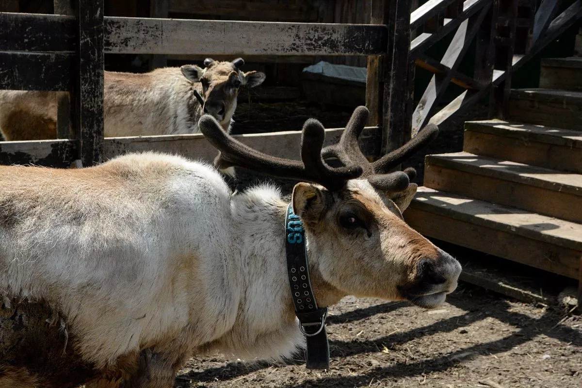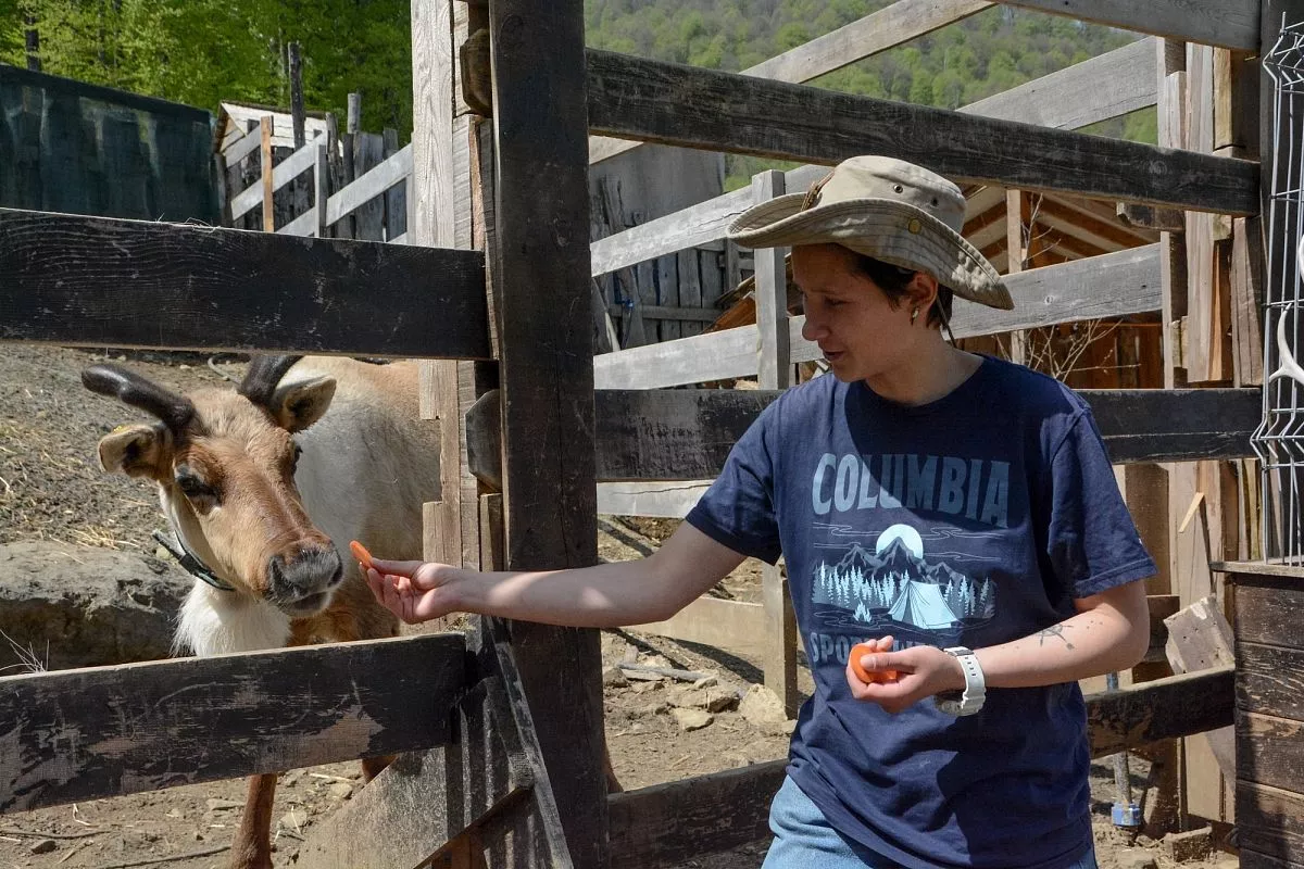 В 2018 году по соседству со спортивно-ездовым лагерем появился природный комплекс. Ее обитателями стали северные красавцы – олени из Воркуты и Ямало-Ненецкого автономного округа. Сейчас здесь обитают восемь животных, к каждому из них требуется свой подход. Инструктор Анна Голикова поясняет: в первую очередь необходимо много терпения. Оленей разводят в больших одомашненных стадах, где люди с ними не всегда близко контактируют. А эти животные любят тех, кто с ними больше общается. Поэтому лучше к ним подходить с вкусняшкой, лаской и нежностью в голосе: олени очень хорошо чувствуют человека и его эмоциональный фон.