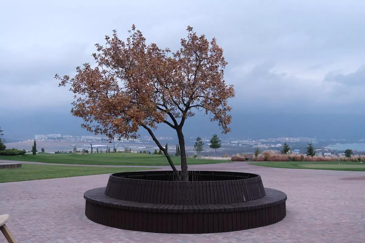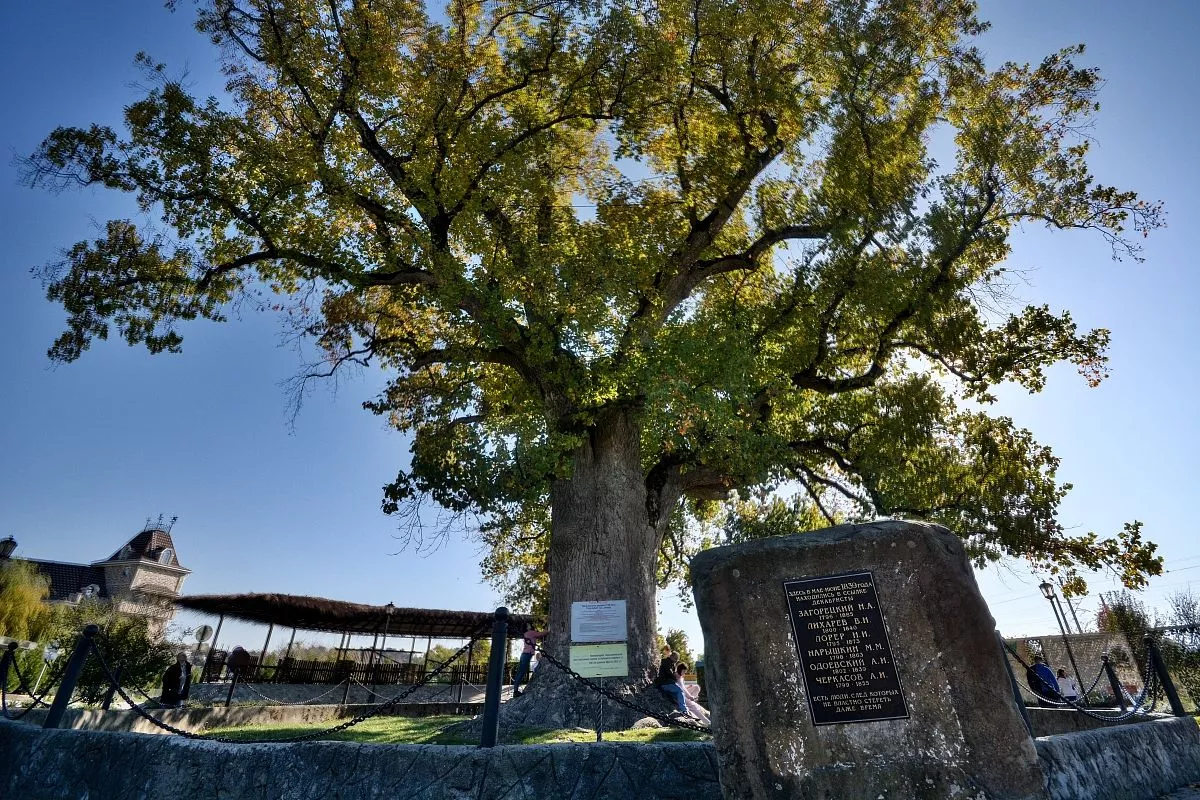 На территории геленджикского гольф-клуба растет могучий дуб, которому не один десяток лет. Весной и летом он ярко-зеленый, а осенью надевает желтый наряд. Вокруг дуба установили деревянные бочки-столы. Здесь туристы могут выпить на свежем воздухе лимонад, кофе или бокал вина.