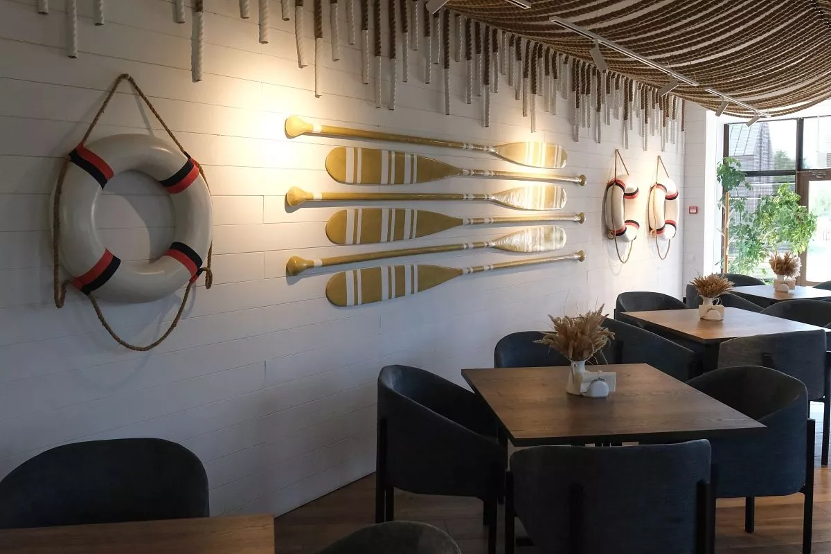 В ресторане базы отдыха на плавнях интерьер выполнен в рыбацком стиле. На стенах – весла и штурвалы.