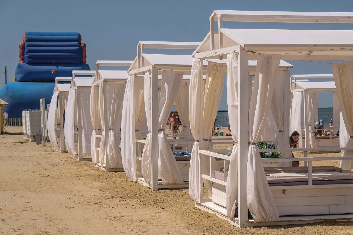 Для удобства отдыхающих на пляже в Приморско-Ахтарске установили белоснежные бунгало с мягкими лежаками. В таких шатрах прохладно в жару. Они пользуются популярностью среди туристов. Бунгало бронируют на несколько дней вперед.