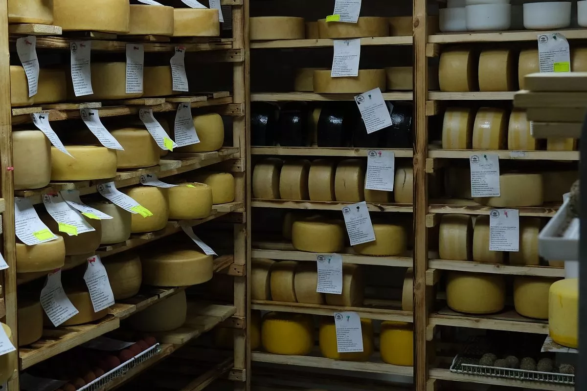 Камеры, где созревают сыры из козьего и коровьего молока, – рай для гурманов. На полках ждут своего часа лакомства разных сортов.