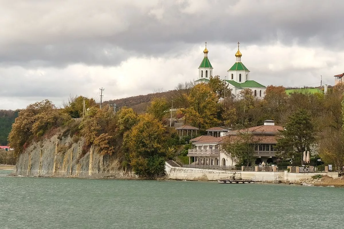 На живописной площадке над озером Абрау построен храм Святой Блаженной Ксении Петербургской. Он выполнен в форме креста, с его восточной стороны полукругом выступает алтарная апсида, а с запада пристроена высокая трехъярусная колокольня. Храм венчает зеленая кровля с шатровыми куполами и золотыми маковками.