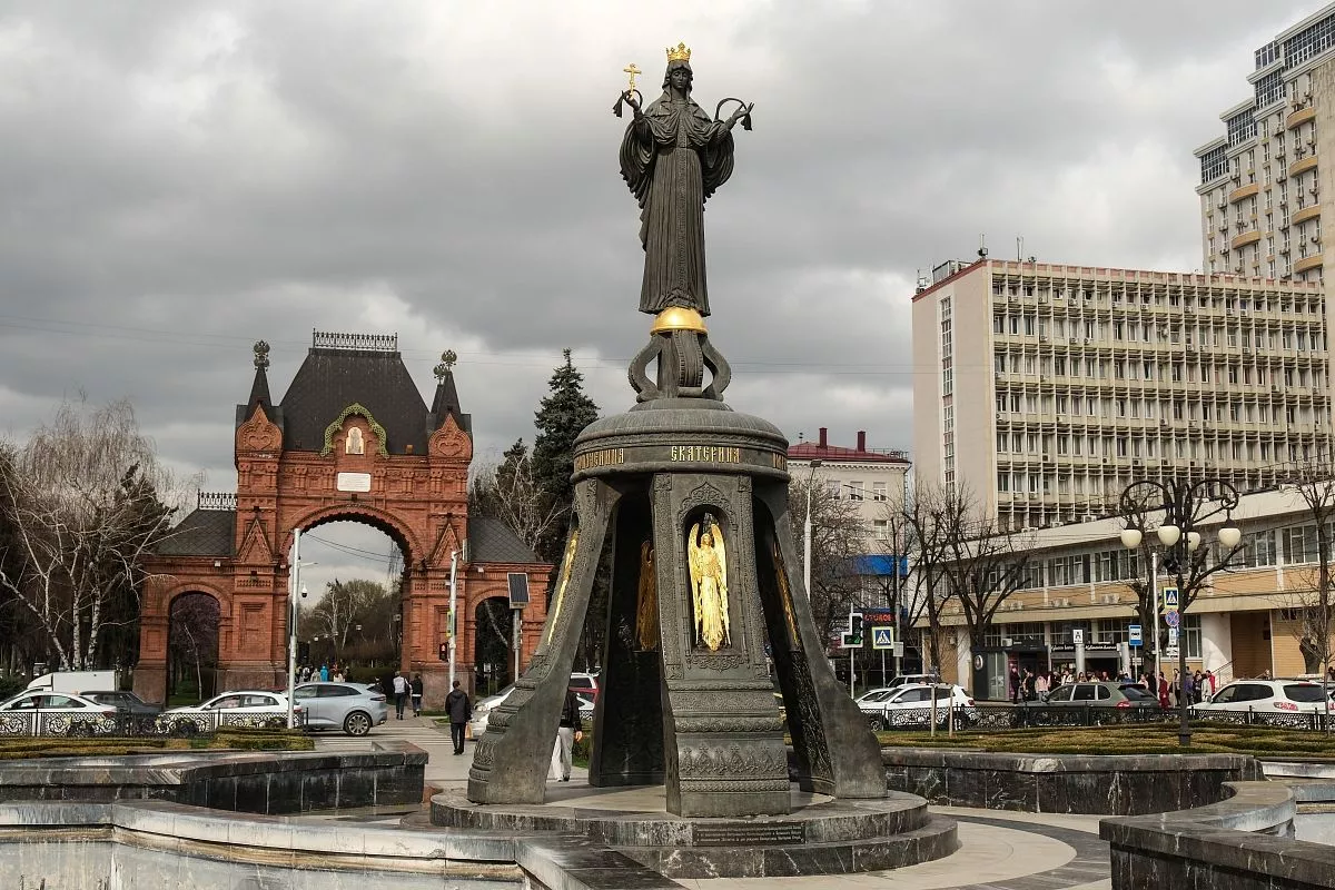 Этот восьмиметровый памятник на центральной улице Краснодара посвящен святой великомученице Екатерине, которая считается покровительницей города. Святая стоит на постаменте, выполненном в виде колокола. Скульптура создана с соблюдением православной иконографии.