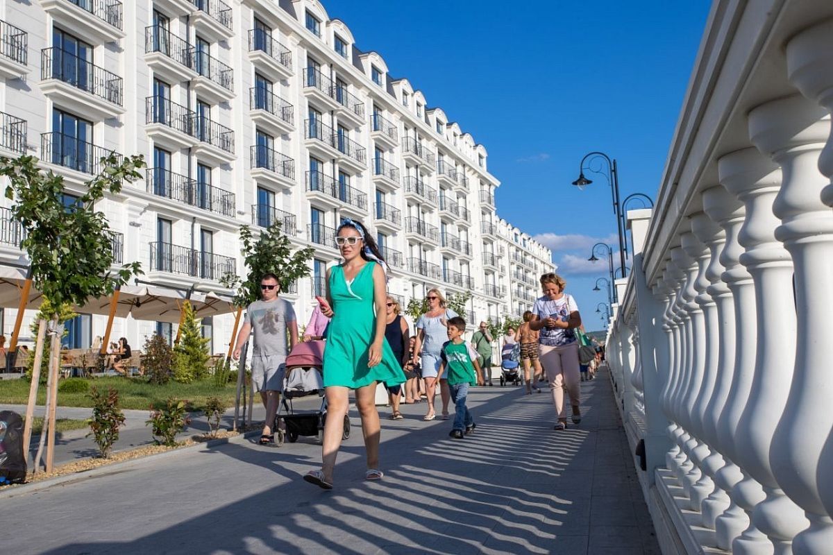 Это широкая двухуровневая набережная с белым ограждением, балясинами и великолепным видом на море. Вдоль прогулочной зоны расположены уютные зоны отдыха с лавочками и зеленью.