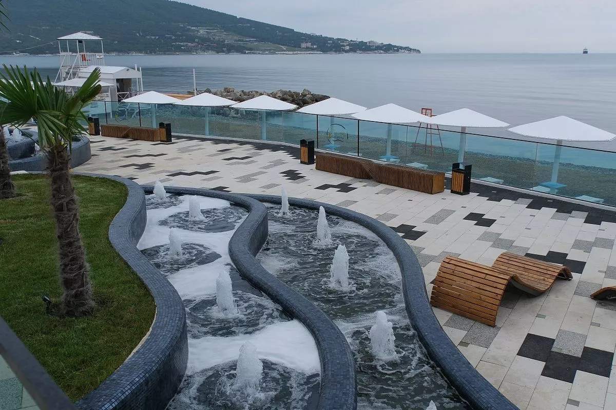 Набережная в Кабардинке удивляет своими фонтанами с подсветкой. Например, таким водным каскадом в виде тоннеля. Проходя по нему, отдыхающие любят загадывать желания.