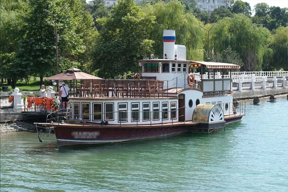 По озеру Абрау от набережной можно совершить прогулку на речном трамвайчике, стилизованном под колесный теплоход позапрошлого века.