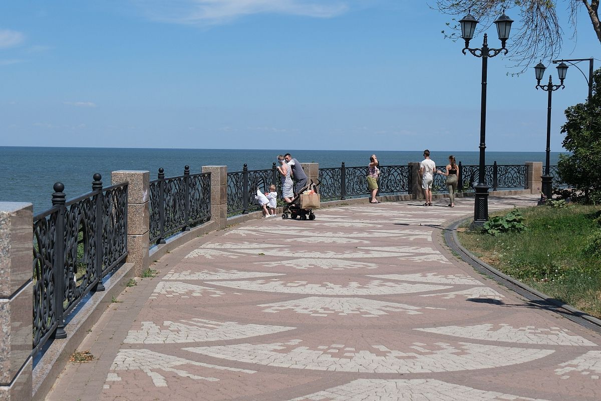 Туристы с удовольствием гуляют по выложенной удобной плиткой набережной Ейска и смотрят на море, опираясь на ажурные перила.