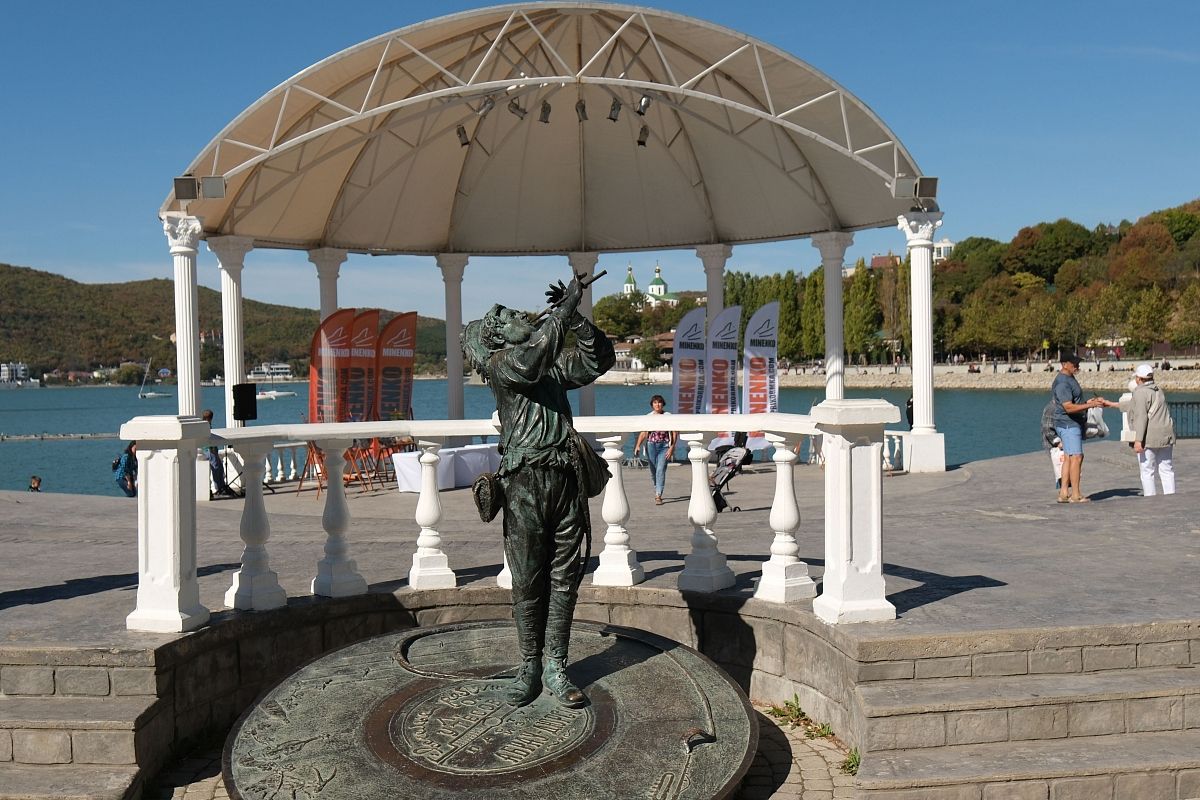 В центре набережной на озере Абрау стоит скульптура известного певца Леонида Утесова.
