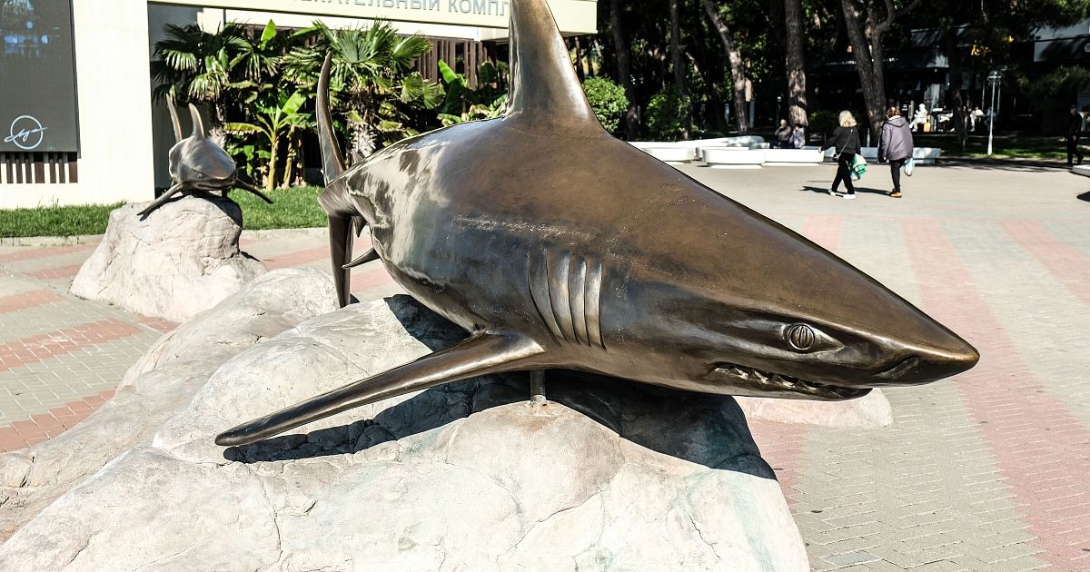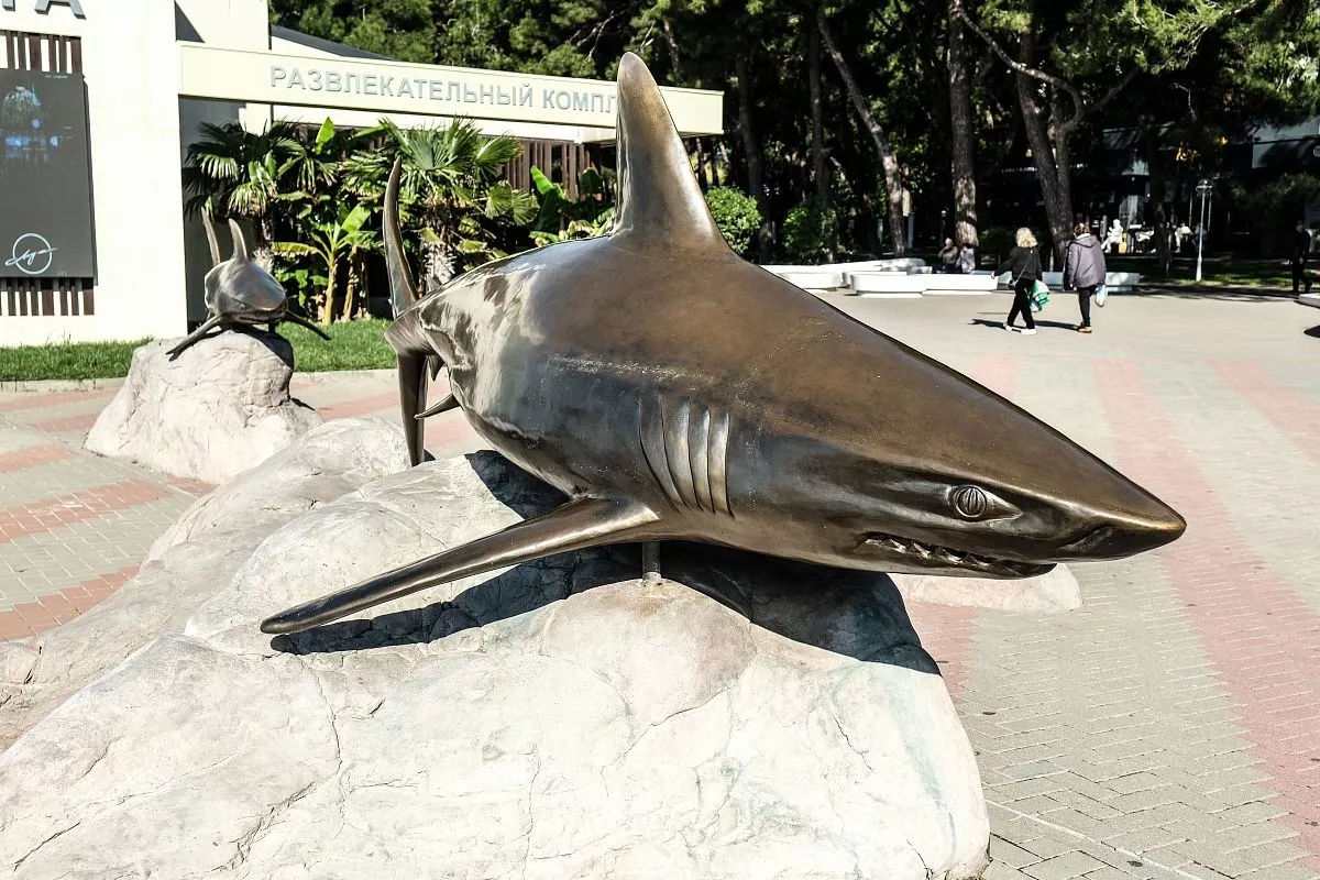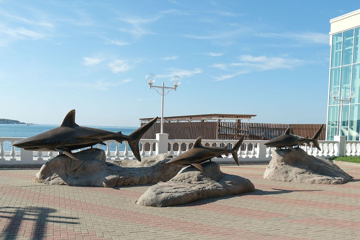 Скульптурная композиция грозных акул приветствует гуляющих по набережной в Геленджике. Конечно, хищные рыбы такого размера в Черном море не водятся. Здесь можно встретить лишь безобидную акулу-катрана.