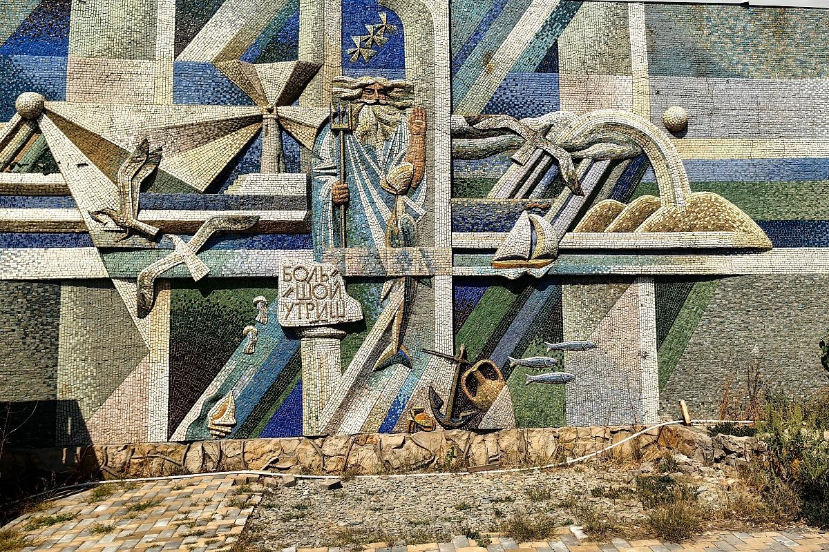 Такое мозаичное панно встречает туристов напротив пляжа поселка Большой Утриш. На нем Посейдон, чайки и амфора, напоминающая об античных корнях черноморского побережья Кубани.