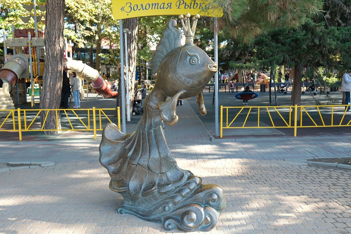 Памятник сказочной золотой рыбке в короне радует маленьких посетителей детской площадки, расположенной на набережной в Геленджике.