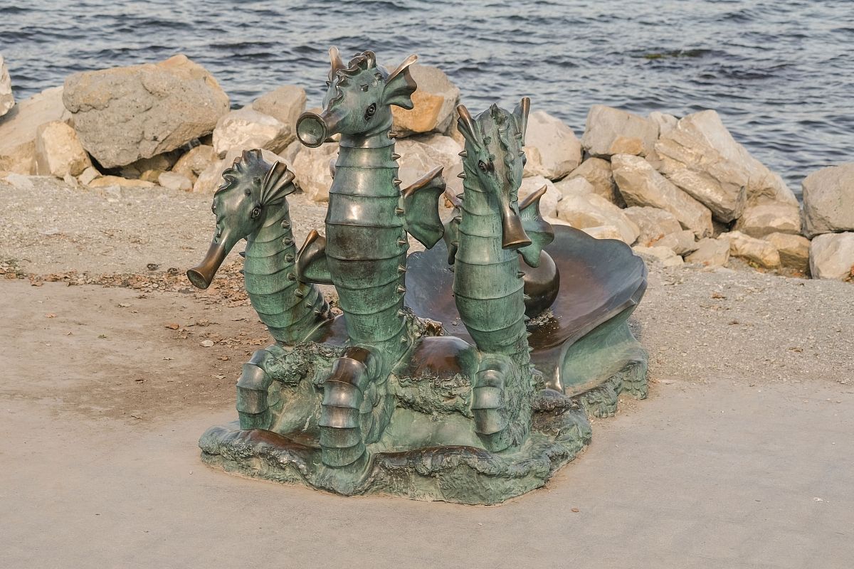 Упряжка морских коньков, везущих на створке раковины драгоценную жемчужину, – еще одна оригинальная композиция. Ее можно увидеть на набережной в Новороссийске.
