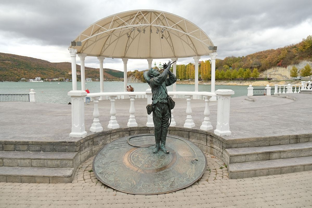 Беседка со скульптурой, изображающей Леонида Утесова в роли пастушка, – любимое место у туристов, гуляющих вдоль озера Абрау.