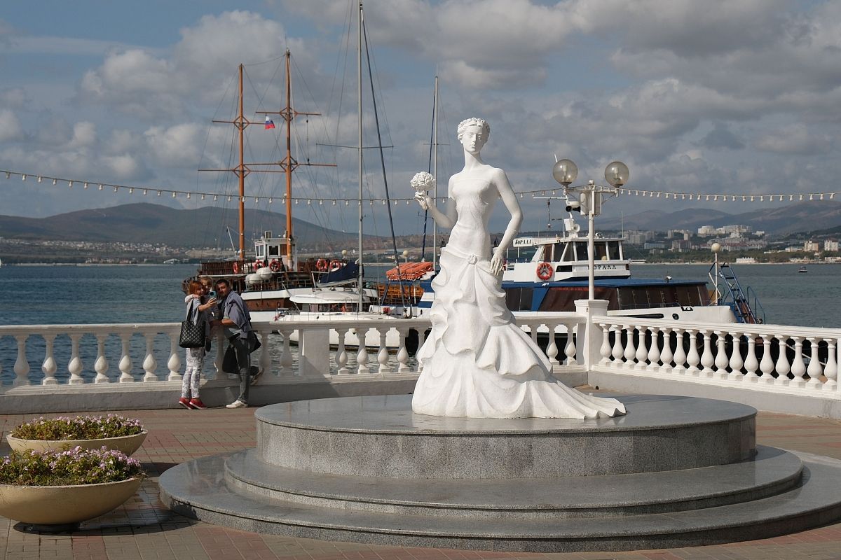 Невесточка в Геленджике встречает туристов в белоснежном платье независимо от сезона.