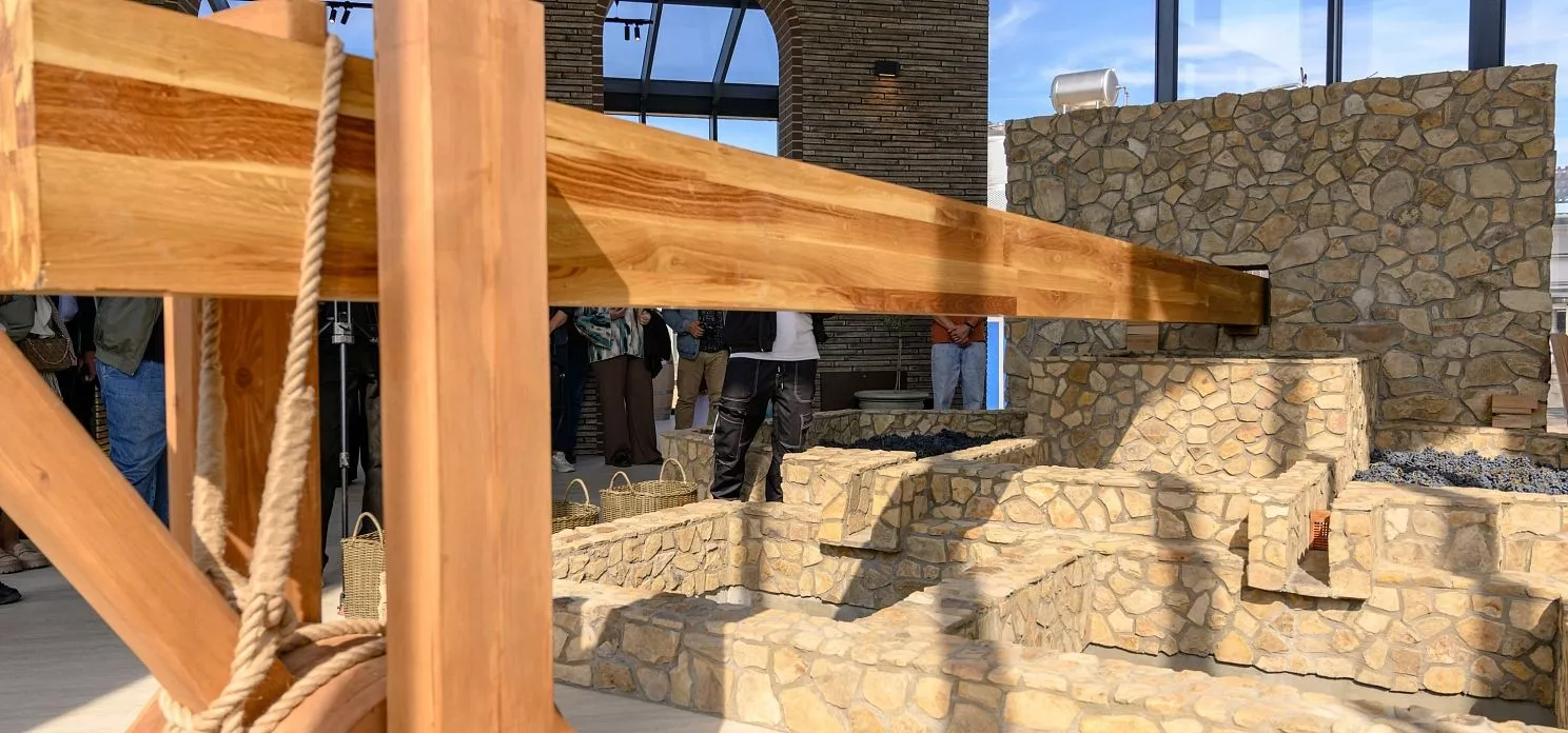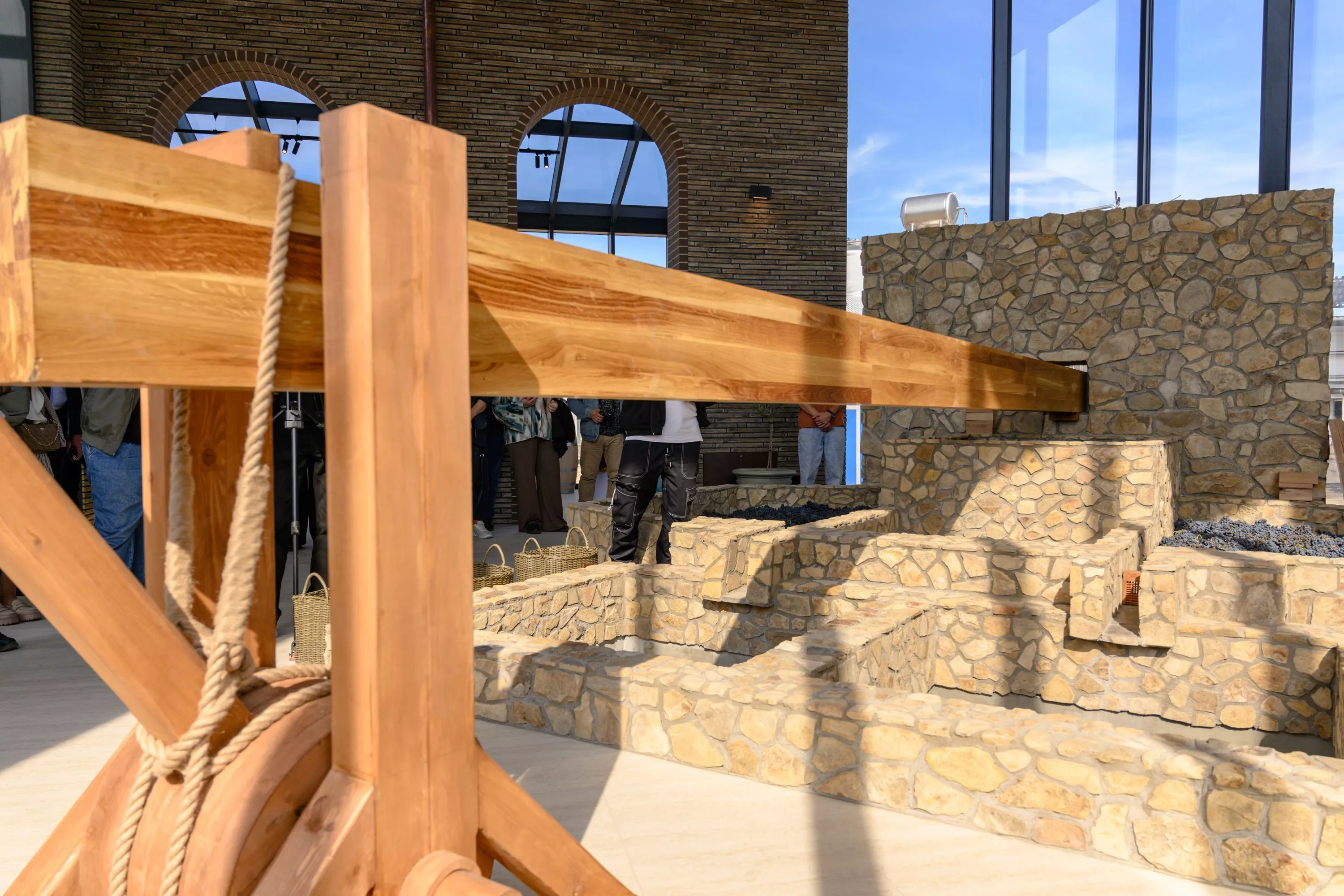 Винодельня представляет собой небольшое многоярусное сооружение, сложенное из камней, найденных во время археологических раскопок. Здесь есть специальные площадки, куда засыпается виноград. А затем под зажигательную греческую музыку его давят прямо ногами, как делали в древности. На открытии к этому увлекательному процессу привлекли первых посетителей винодельни.