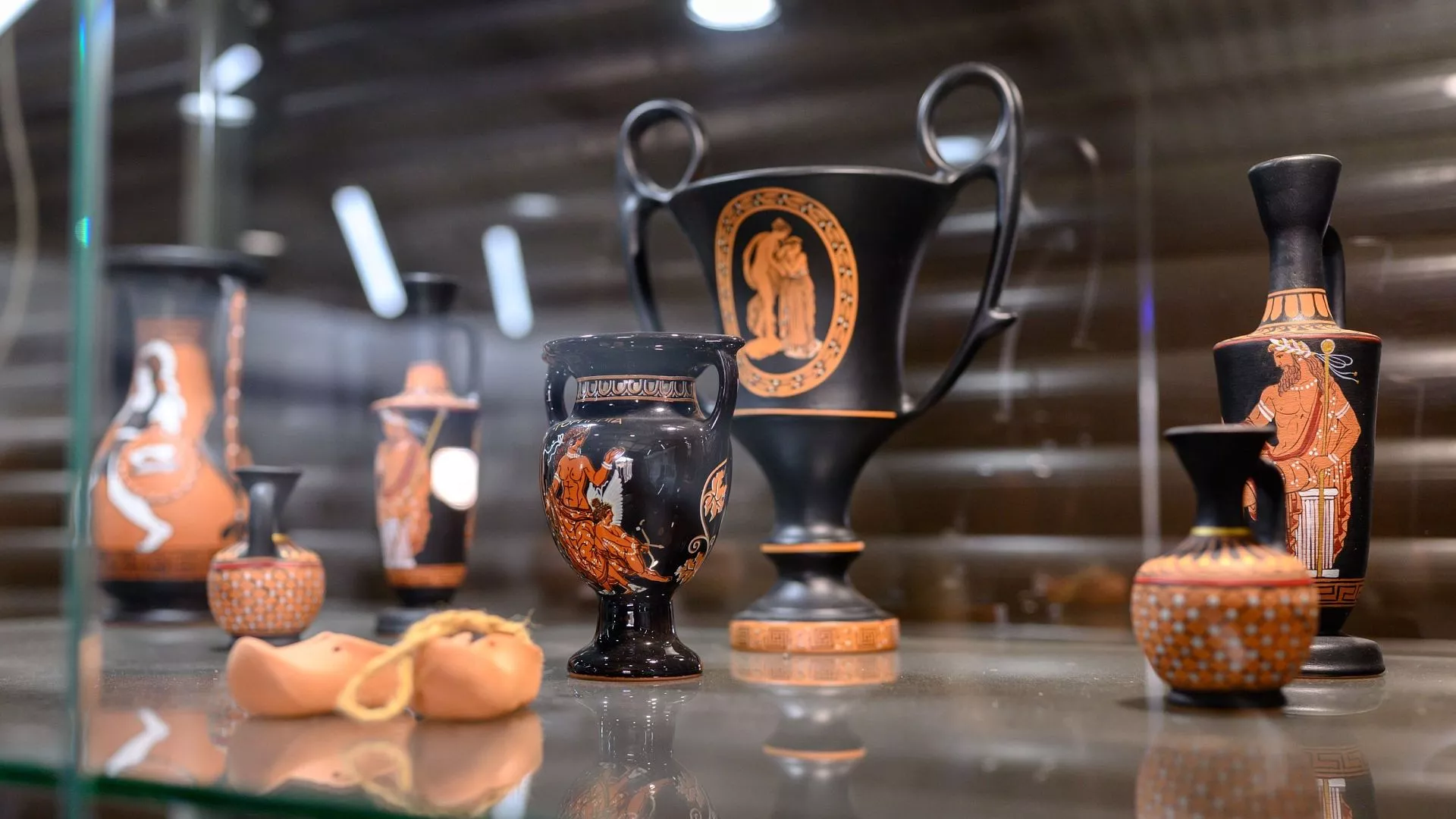 Туристы также могут увидеть в павильоне разнообразные чаши, служившие древним грекам во время застолий. В одних разбавляли виноградные напитки, в других подавали к столу.